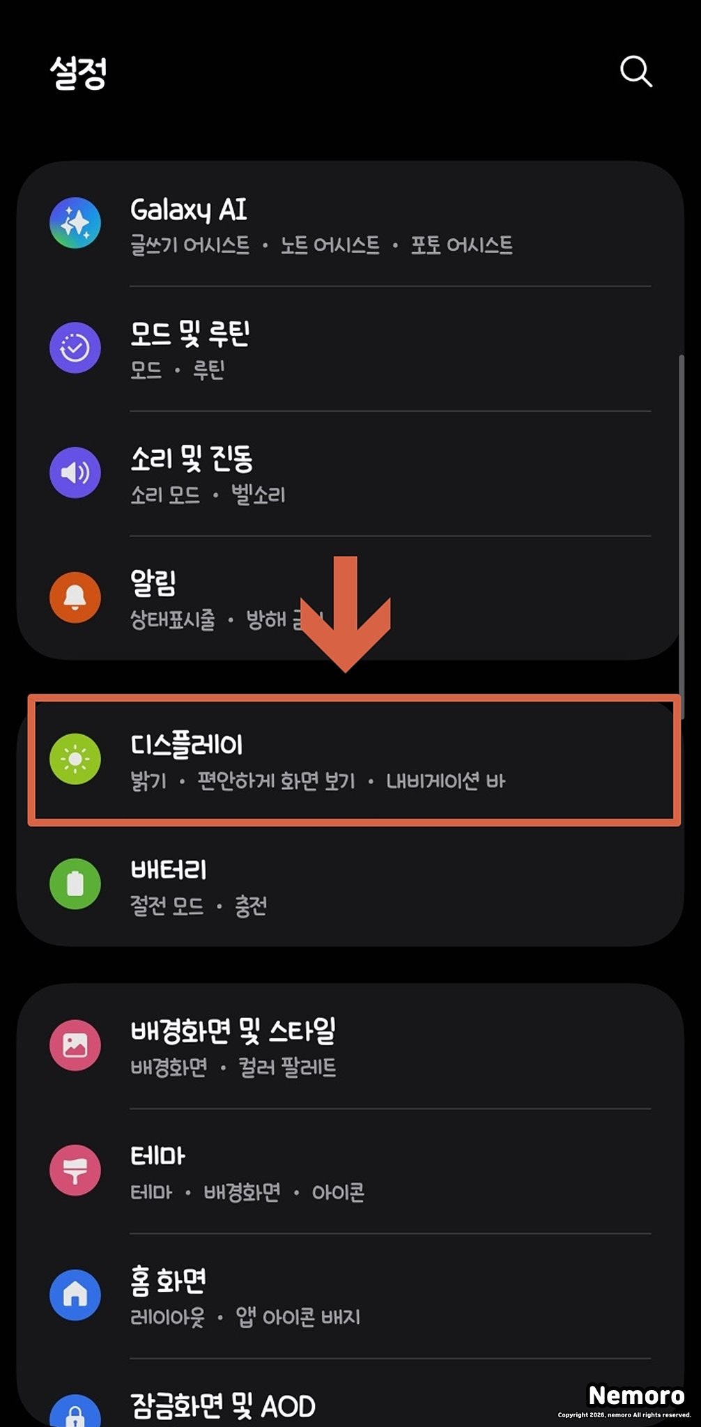 가장 갤럭시 스마트폰의 설정을 열어주세요. 설정 페이지로 이동하면 스크롤하여 [디스플레이] 메뉴를 선택해 주시면 됩니다.