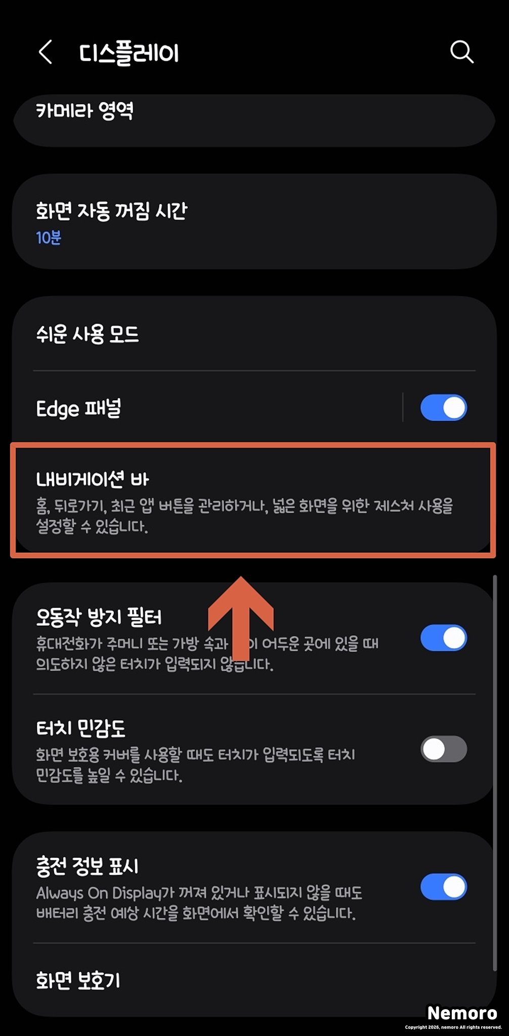 디스플레이 화면으로 들어오셨다면, 화면을 아래로 조금 더 내려주세요. 중간쯤에 홈, 뒤로 가기, 최근 앱 버튼을 관리하거나 넓은 화면을 위한 제스처 사용을 설정할 수 있는 [내비게이션 바] 메뉴를 선택해 주시면 됩니다.