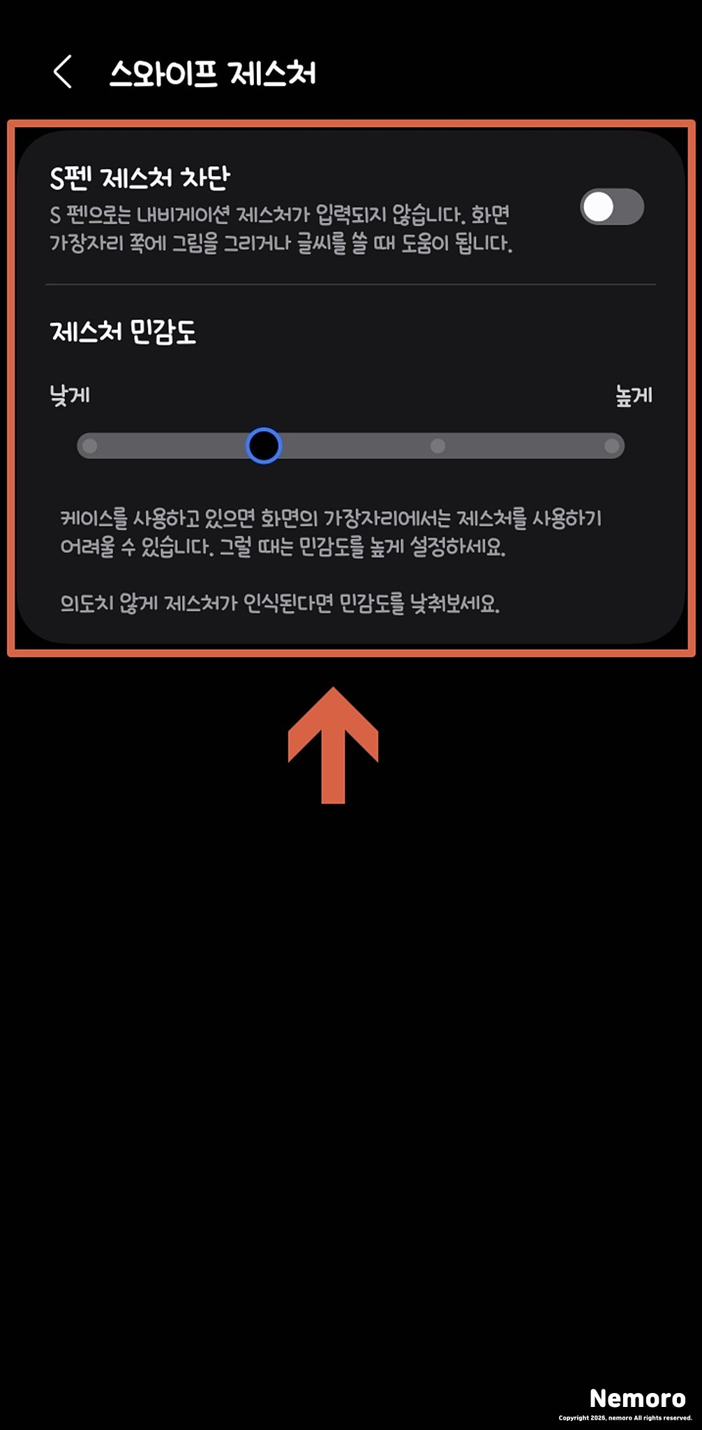 특히 두꺼운 케이스를 사용하고 계신다면 화면 가장자리에서 제스처를 사용하기 어려울 수 있습니다. 이때 체스처 민감도의 파란색 점을 우측으로 움직여서 민감도를 높게 설정해 주시면 됩니다. 반대로 의도치 않게 너무 자주 인식이 된다면 좌측으로 낮춰보세요.