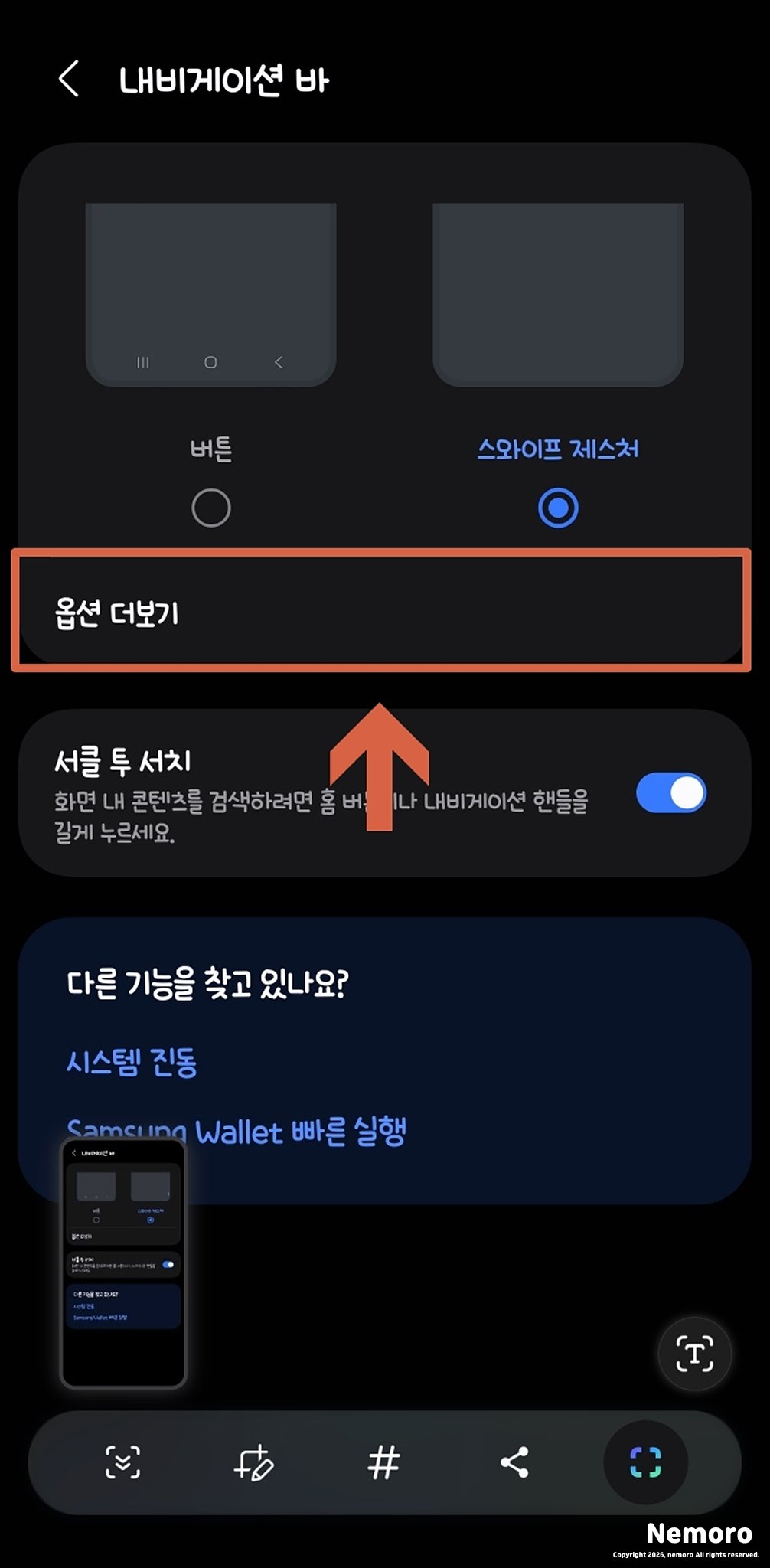 스와이프 제스처를 선택한 후, 바로 아래에 활성화된 [옵션 더 보기]를 클릭해 주세요. 이곳에서는 제스처를 더욱 내 손에 맞게 세밀하게 세팅이 가능한데요.