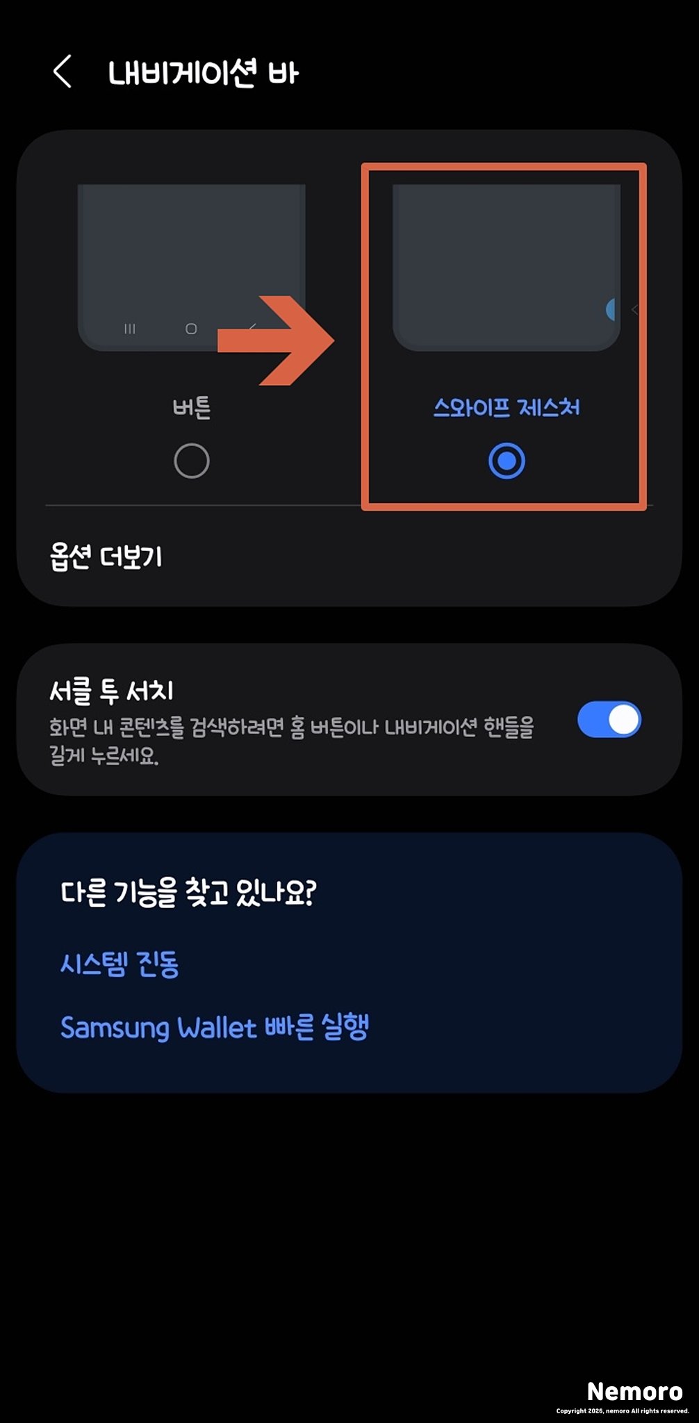 기본적으로 [버튼] 방식에 체크가 되어 있을 텐데요. 이것을 오른쪽에 있는 [스와이프 제스처]로 선택해 주시면 끝입니다.