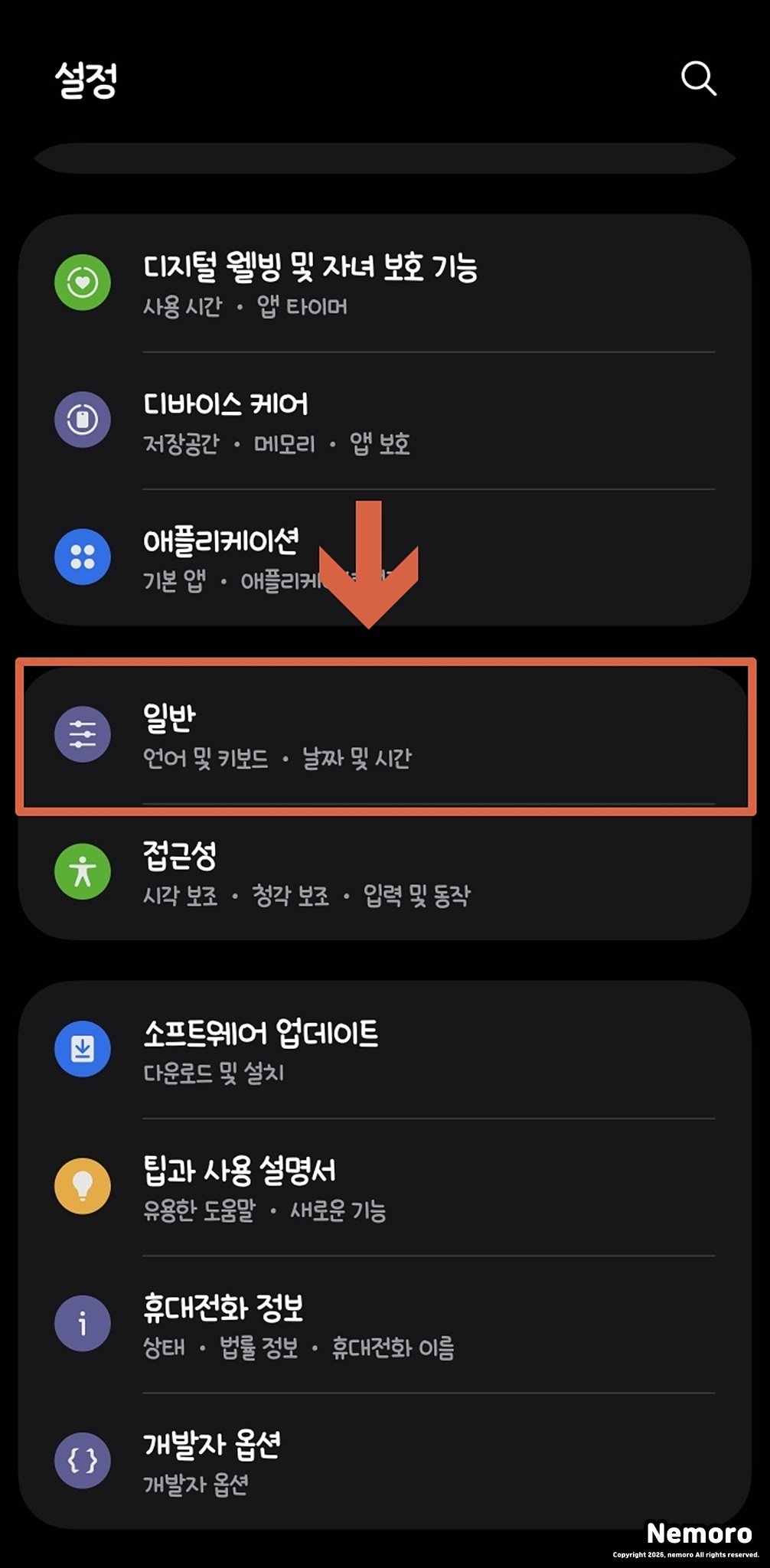 키보드 설정을 바꾸기 위해서는 먼저 갤럭시의 설정 앱을 실행해 주세요. 그리고 화면을 아래로 스크롤하여 [일반] 메뉴를 찾아서 선택해 주세요.