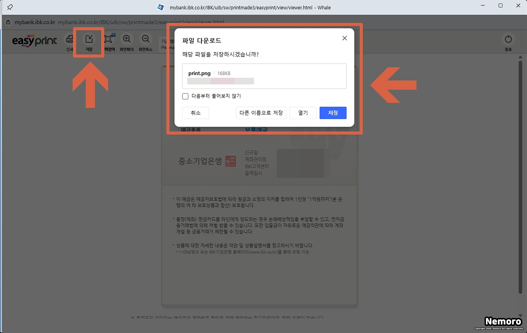 이번에는 기업은행 인터넷 뱅킹에서 제공하는 저장 방법인데요. 통장 표지 인쇄 페이지에서 [저장] 버튼을 클릭하면 PNG 파일로 저장이 가능합니다.