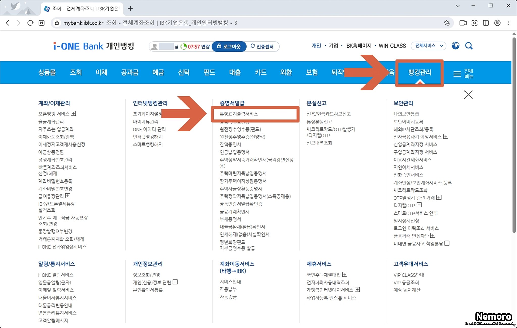 로그인을 진행한 후, 메인 페이지 상단에 있는 메뉴 탭에서 [뱅킹 관리] - [증명서 발급] 탭 - [통장 표지 출력 서비스]를 선택해 주세요.
