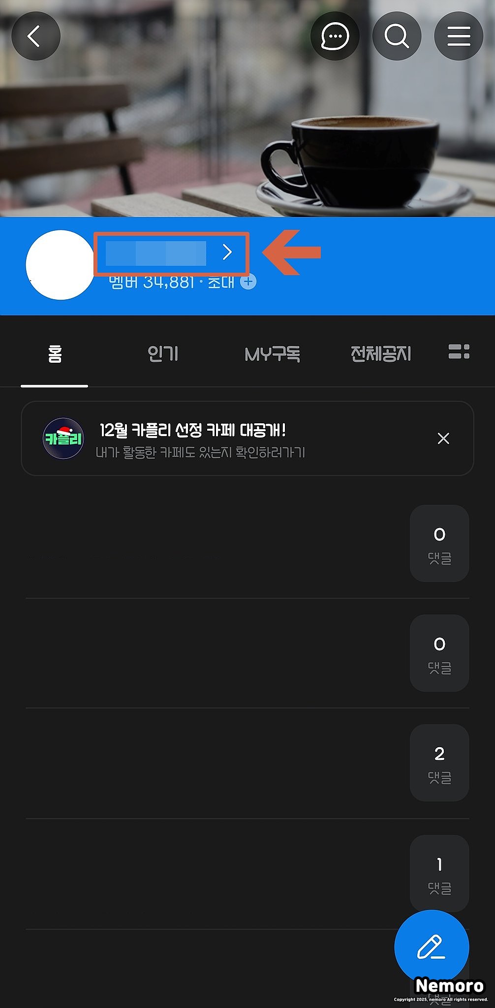 네이버 카페 앱을 실행하셔서 로그인을 진행해 주세요. 그리고 탈퇴하고자 하는 카페를 찾아서 선택하여 해당 카페에 접속해 주세요. 그리고 카페 메인 페이지 상단에서 카페명 오른쪽에 있는 화살표 모양(카페 정보)을 선택해 주세요.