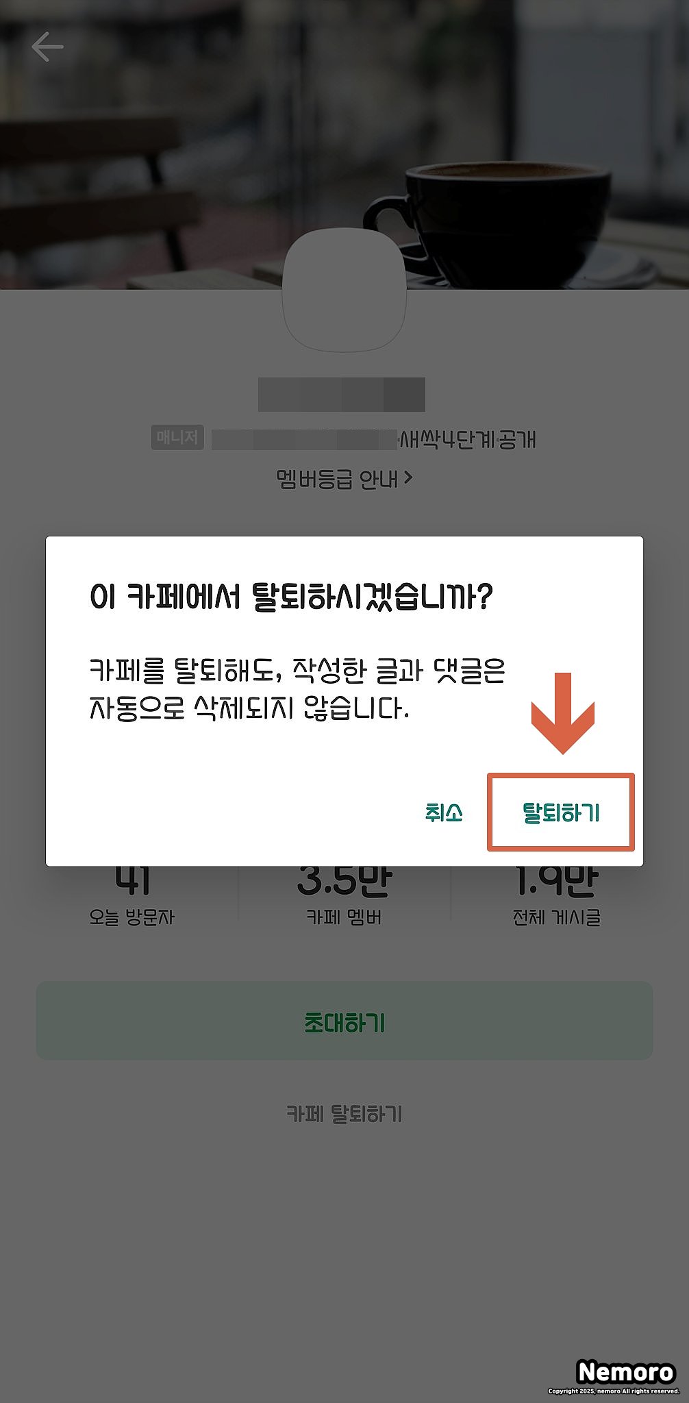 "이 카페에서 탈퇴하시겠습니까? 카페를 탈퇴해도, 작성한 글과 댓글은 자동으로 삭제되지 않습니다."라는 문구와 함께 팝업창이 생성됩니다. 여기서 [탈퇴하기]를 선택하시면 해당 카페 탈퇴가 완료됩니다.