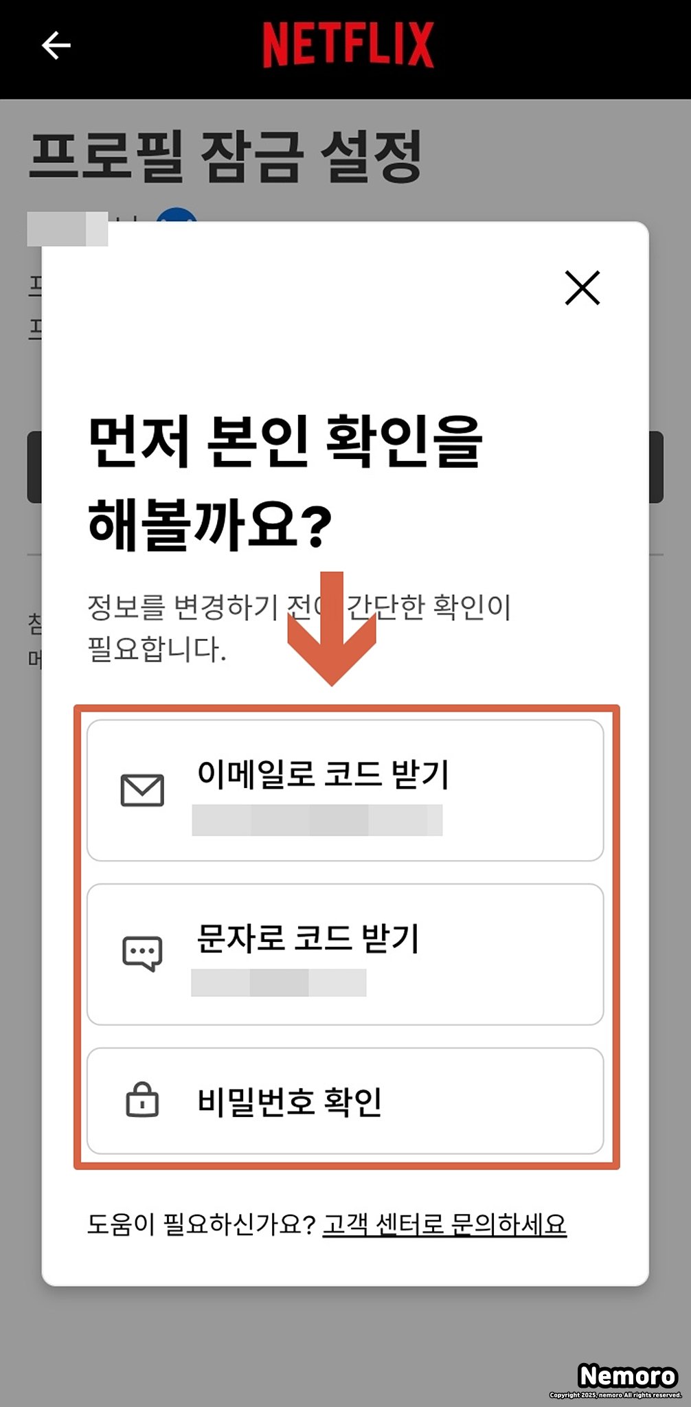 본인 확인을 위해 이메일, 문자 코드 수신 또는 계정 비밀번호 입력 중 하나를 선택하여 진행해 주세요. 넷플릭스 계정을 공유받고 있는 중이라면 [비밀번호 확인]을 통해서 비밀번호만 입력하면 PIN 번호 설정이 가능합니다.