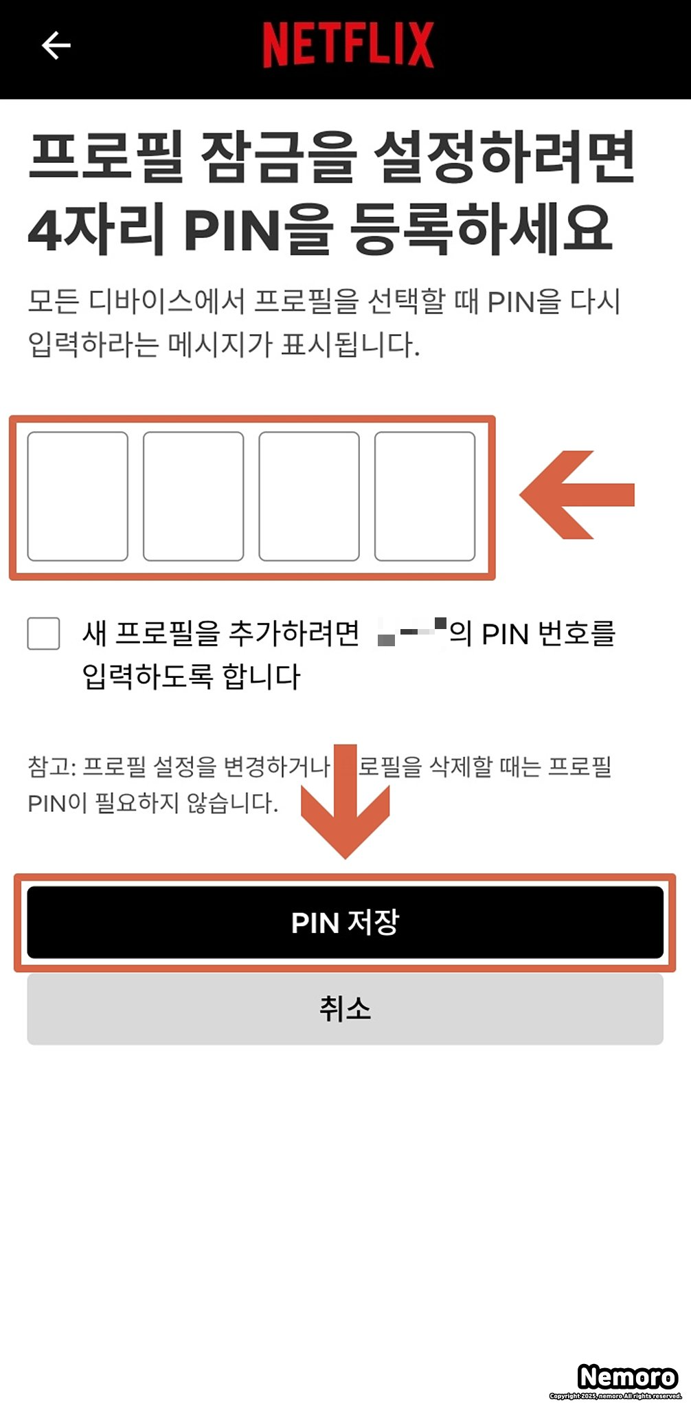 본인 확인이 완료되었다면 이제 원하는 4자리 숫자로 PIN 번호를 입력하고 [PIN 저장] 버튼을 눌러주시면 프로필 잠금 설정이 완료됩니다.