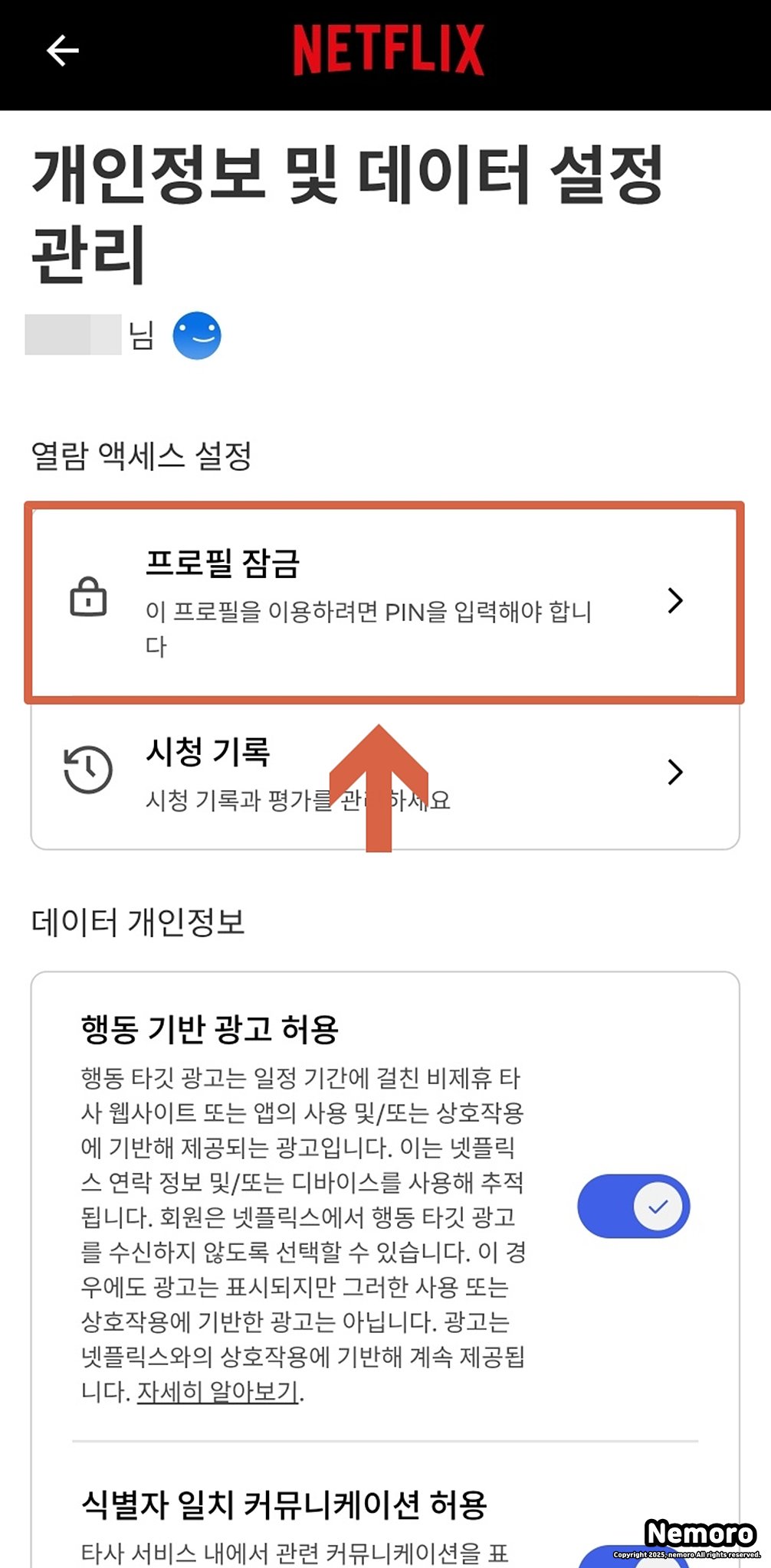 열람 액세스 설정 메뉴 중 첫 번째 항목인 [프로필 잠금]을 눌러 주세요. 이 기능을 사용하면 해당 프로필을 열기 전에 4자리 PIN 번호를 입력해야 합니다.