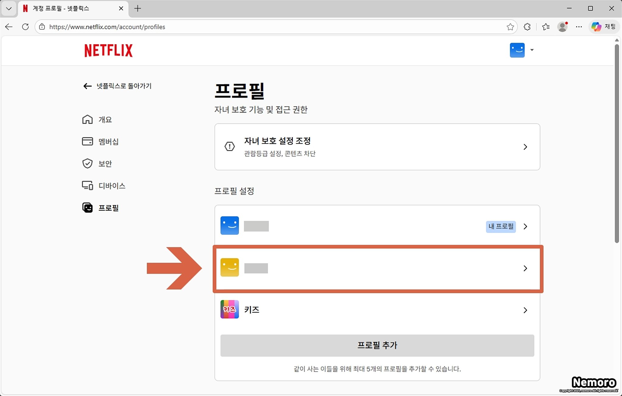 프로필 관리 페이지에서는 현재 넷플릭스에 등록되어 있는 모든 프로필을 확인하실 수 있습니다. 여기서 잠금 설정을 진행하고자 하는 프로필을 찾아주신 후에 오른쪽에 있는 [화살표] 아이콘을 클릭해 주세요.