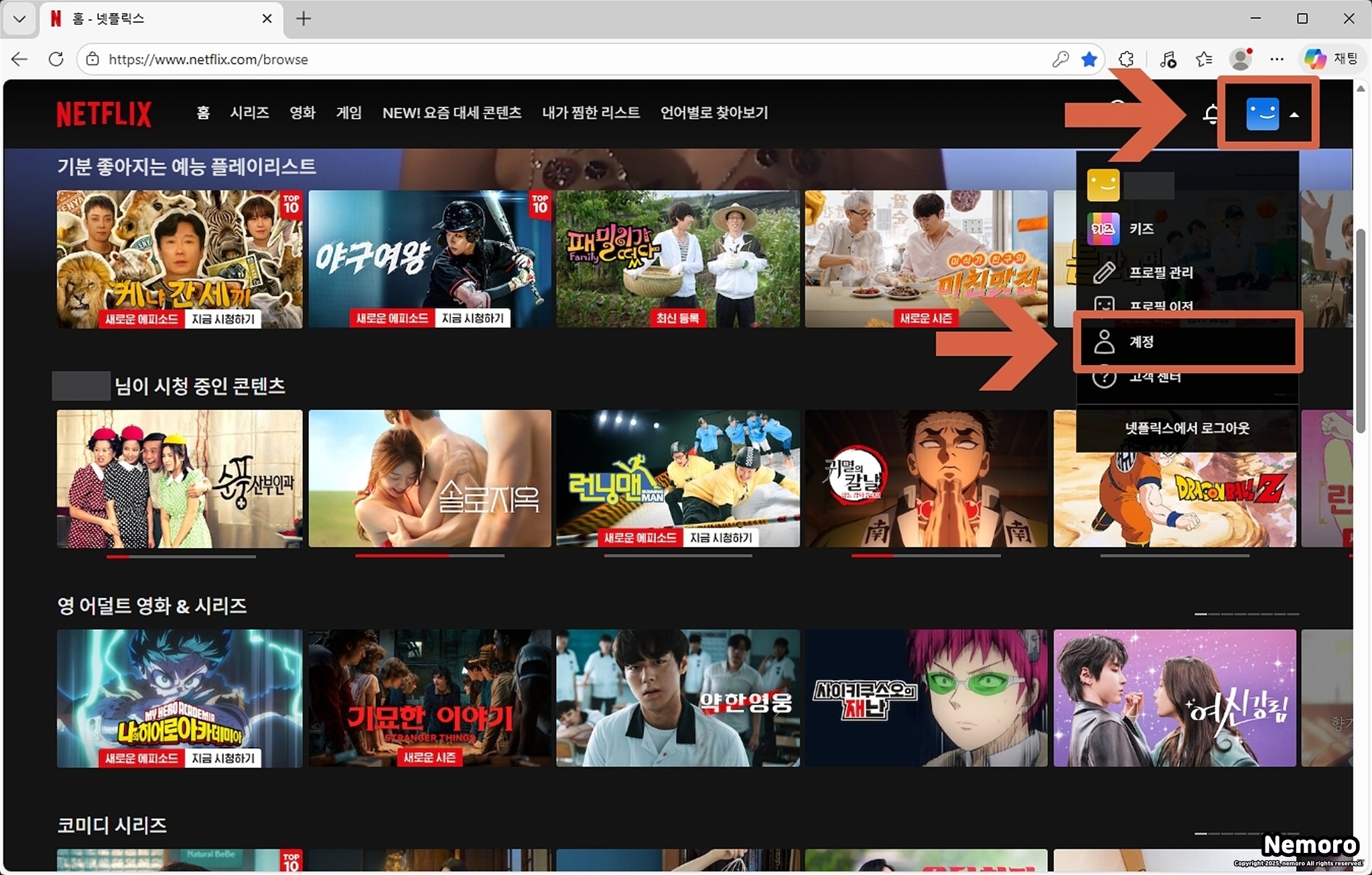 PC에서 넷플릭스를 실행하여 로그인을 진행한 후, 프로필을 선택하고 메인 페이지로 이동해 주세요. 그리고 오른쪽 상단에 있는 프로필을 클릭하여 [계정]에 들어가 주시면 됩니다.
