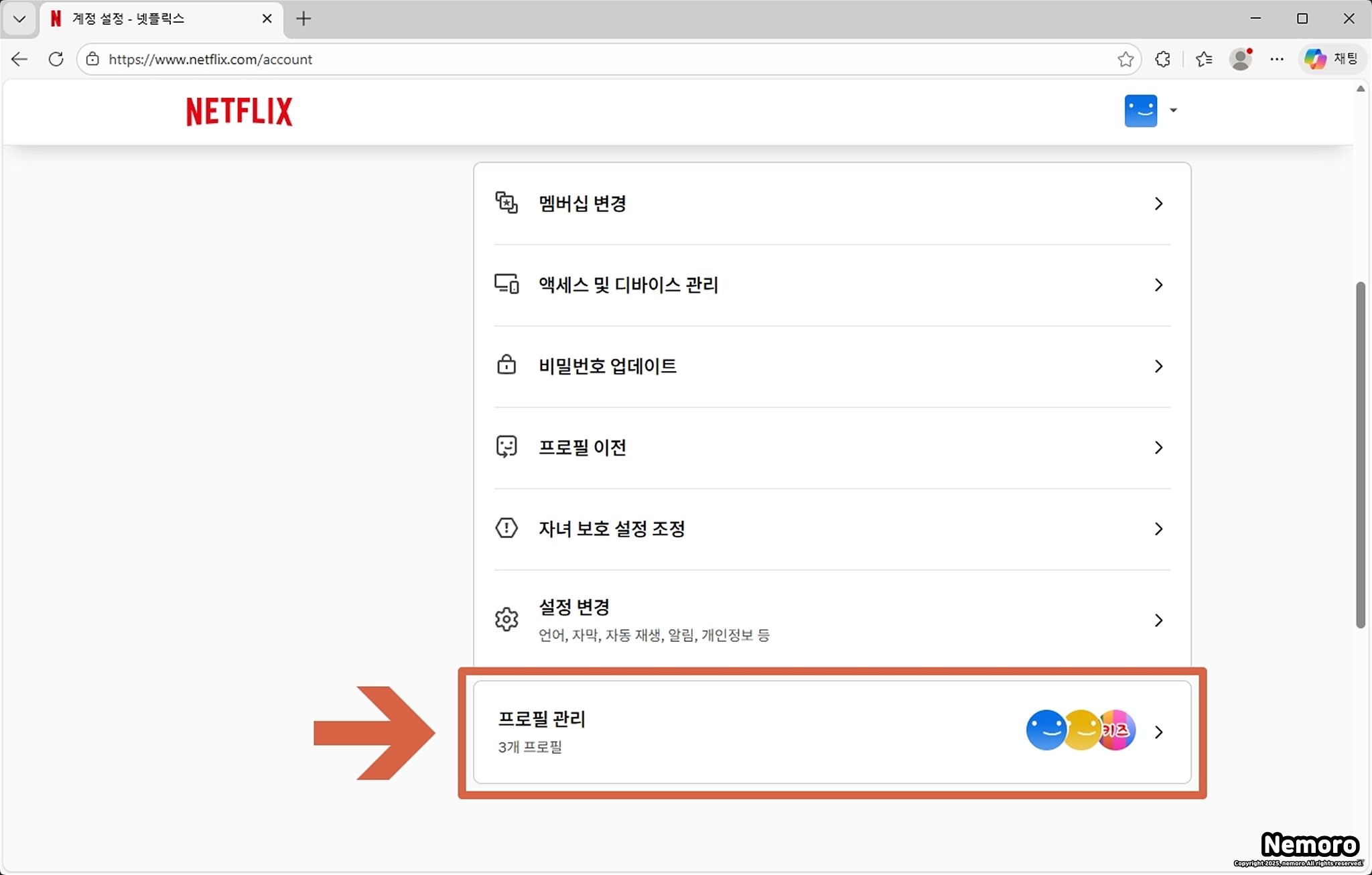 넷플릭스 계정 페이지에서는 결제 수단 변경, 멤버십 정보, 비밀번호 설정 등을 진행할 수 있는데요. 계정 페이지로 이동하면 아래로 스크롤하여 [프로필 관리] 박스를 찾아 클릭해 주시면 됩니다.