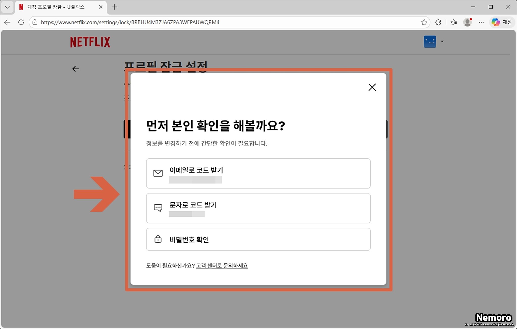 ▣ 넷플릭스 계정을 공유받아서 이용하는 경우에는 문자나 이메일은 불가능해서 [비밀번호 확인]을 선택해서 진행하시면 됩니다.