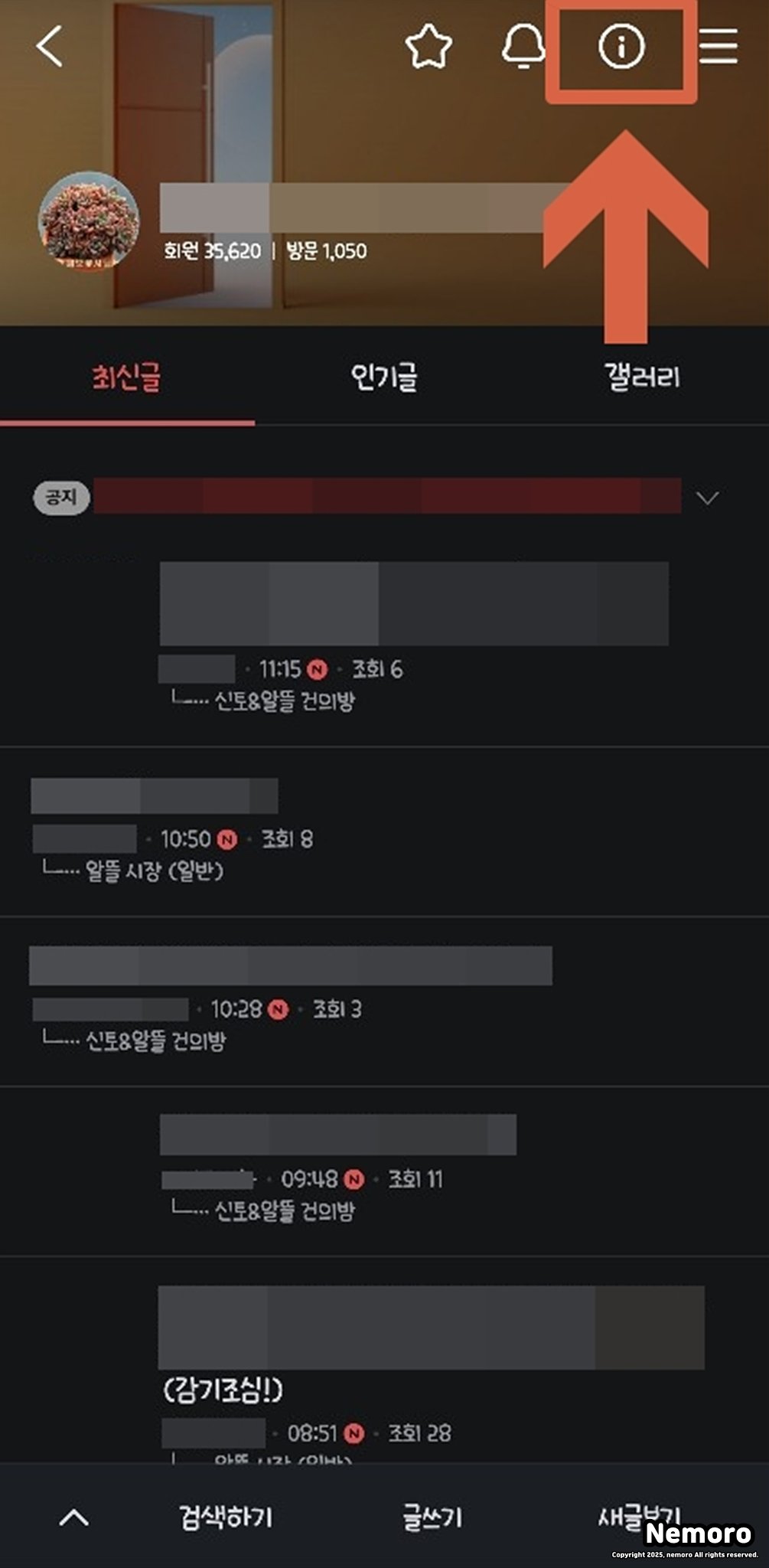 그리고 오른쪽 상단에 있는 [i] 모양 아이콘을 선택해 주세요. 이 버튼을 누르면 해당 카페의 정보 페이지로 이동하게 되며, 여기서 탈퇴 메뉴에 접근할 수 있습니다.