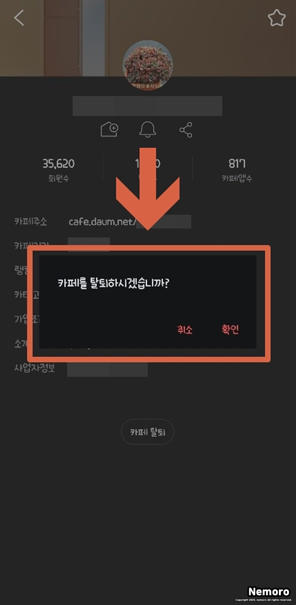 카페 정보 화면에서 스크롤을 아래로 내리면 [카페 탈퇴]라는 버튼이 있습니다. [카페 탈퇴] 버튼을 선택하면 "카페를 탈퇴하시겠습니까?"라는 팝업창이 생성됩니다.