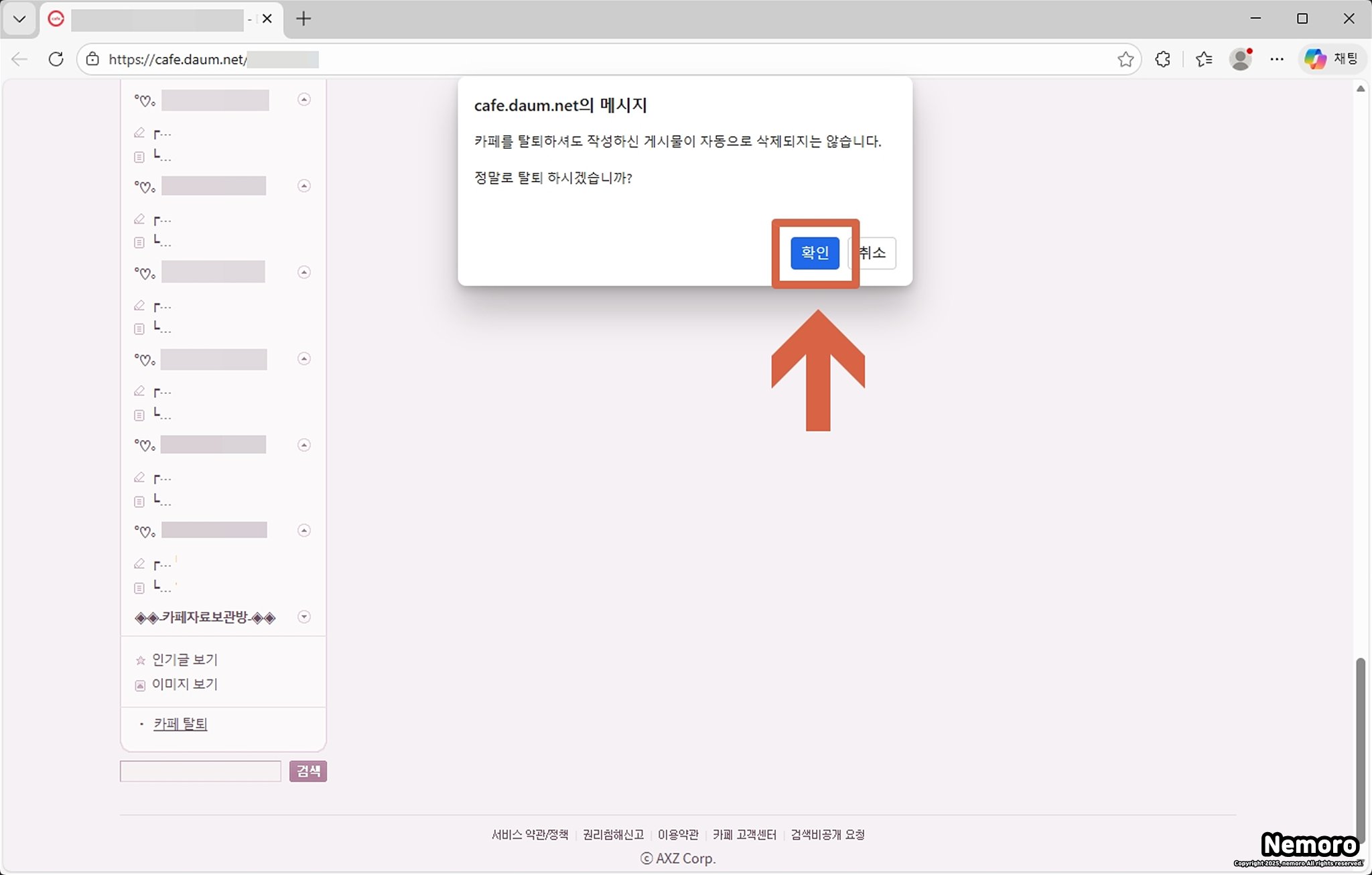 "카페를 탈퇴하셔도 작성하신 게시물이 자동으로 삭제되지는 않습니다. 정말로 탈퇴하시겠습니까?"라는 문구와 함께 팝업창이 생성됩니다. 여기서 [확인] 버튼을 누르면 다음 카페 탈퇴가 완료됩니다.