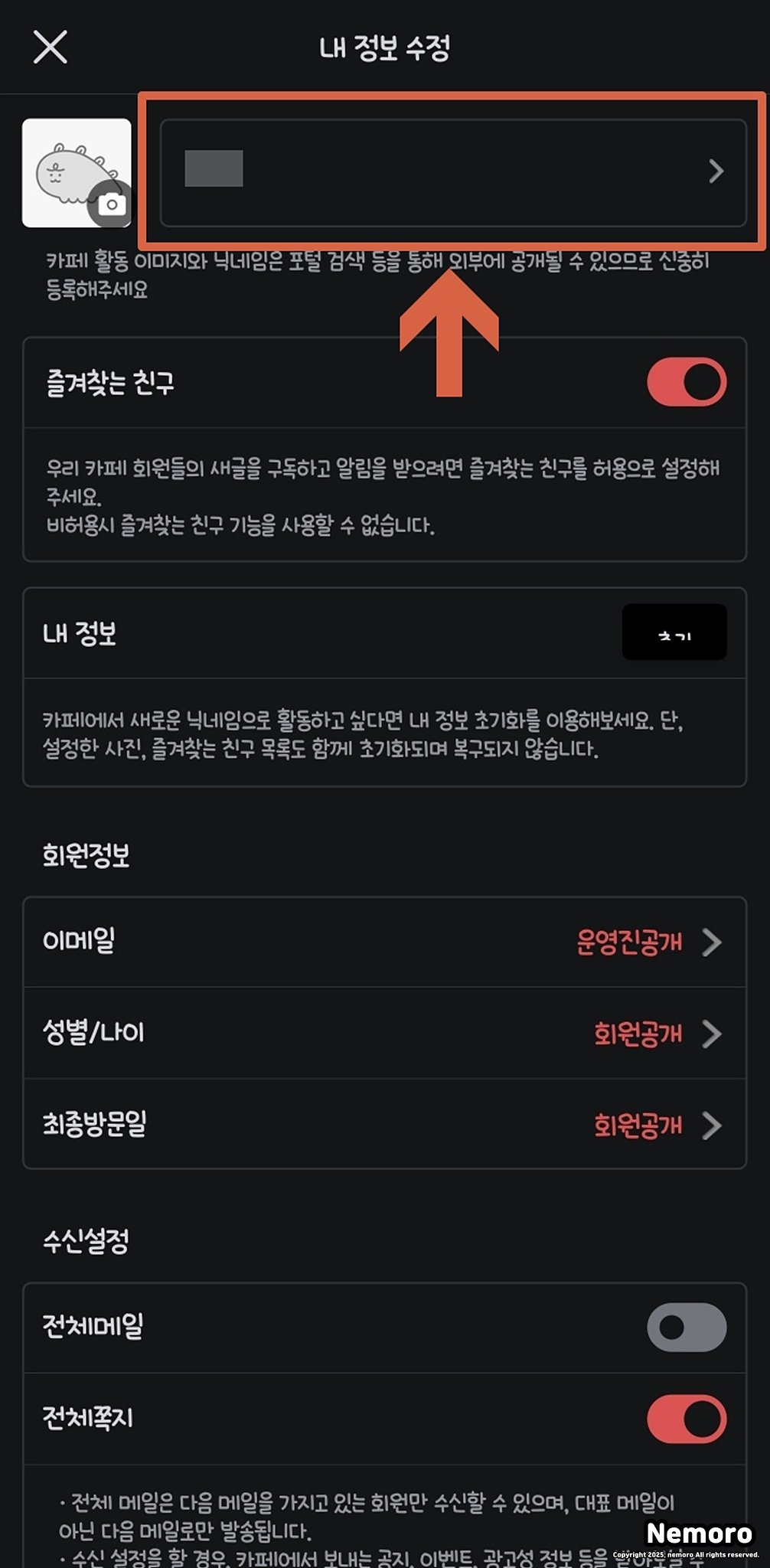 카페에서 사용하는 닉네임을 포함해 프로필 이미지, 친구 공개 설정 등도 이곳에서 바꿀 수 있답니다.