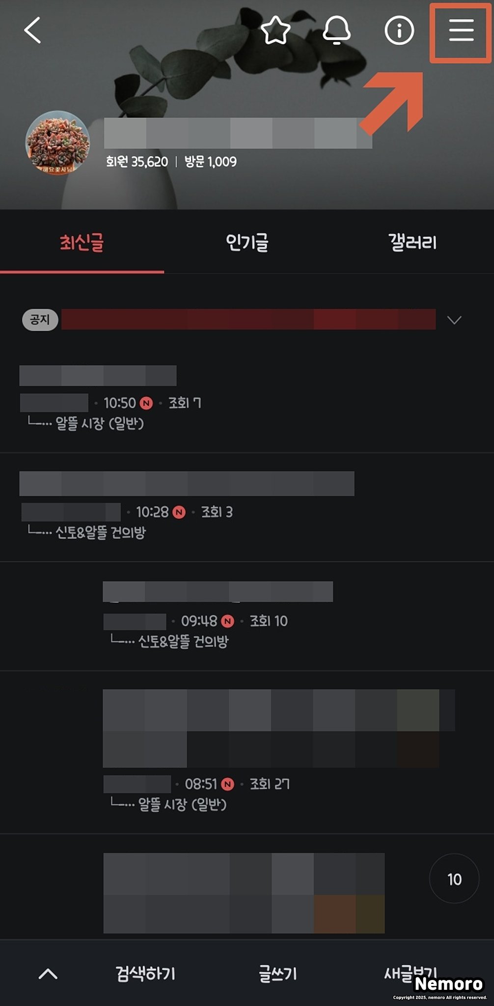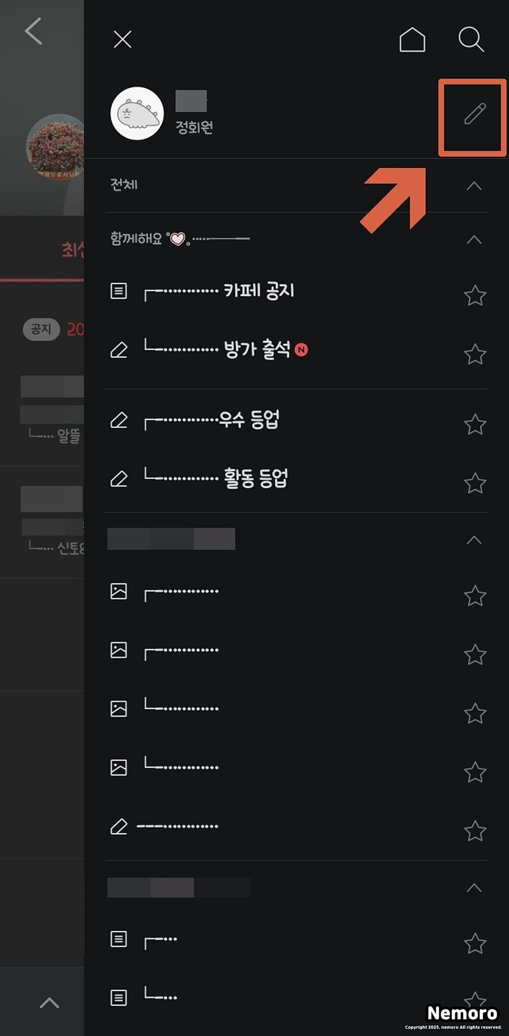 그리고 메인 페이지 오른쪽 상단에 있는 [가로 세 줄 아이콘(☰)]을 선택해 주세요. 이 메뉴를 열면 내가 가입한 카페의 전체 구성과 설정 항목들이 나타납니다.
