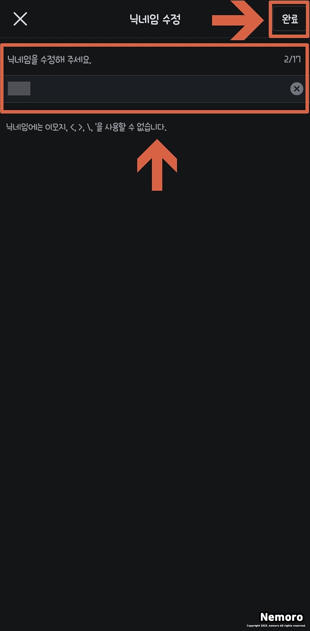 닉네임 입력을 마쳤다면 화면 오른쪽 상단의 "완료" 버튼을 꼭 눌러야 저장됩니다. 단, 닉네임에는 특수문자(예 : <, >, ,)는 사용할 수 없다는 점도 확인해 주세요.