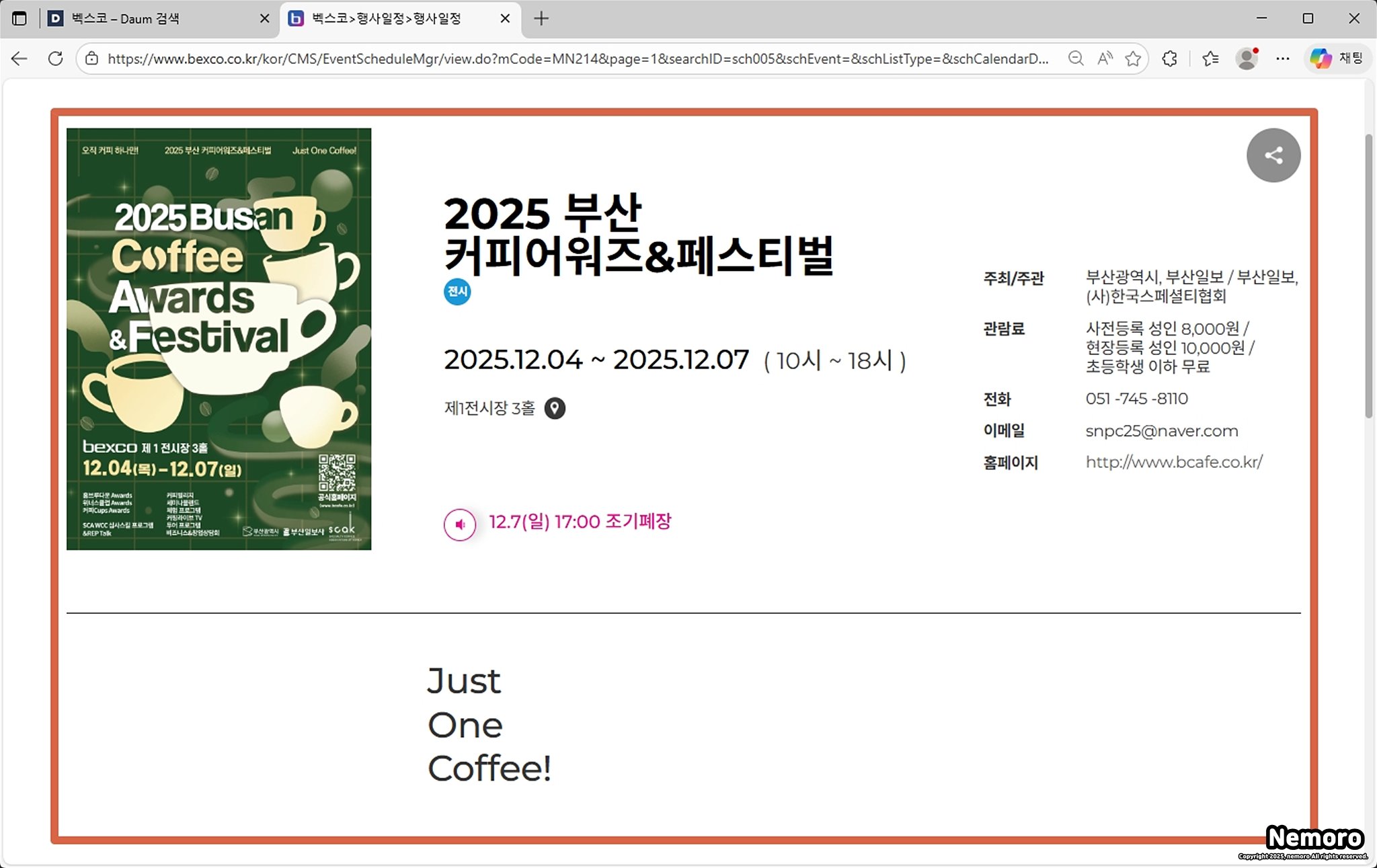 저는 2025년 12월 4일 목요일부터 12월 7일 일요일까지 개최한 2025 커피어워즈&페스티벌 행사를 클릭해 보았는데요. 해당 행사가 언제 어디에서 몇 시에 개최하는지 정보가 표시되어 쉽게 알아볼 수 있었습니다.