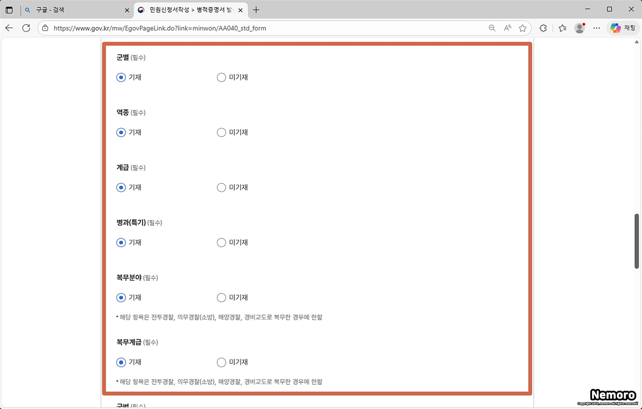- 군별, 역종, 계급, 병과(특기), 복무분야, 복무계급이 병적증명서에 표시되길 원하시는 분들은 [기재]를 선택하고, 필요 없다면 [미기재]를 선택하시면 됩니다.