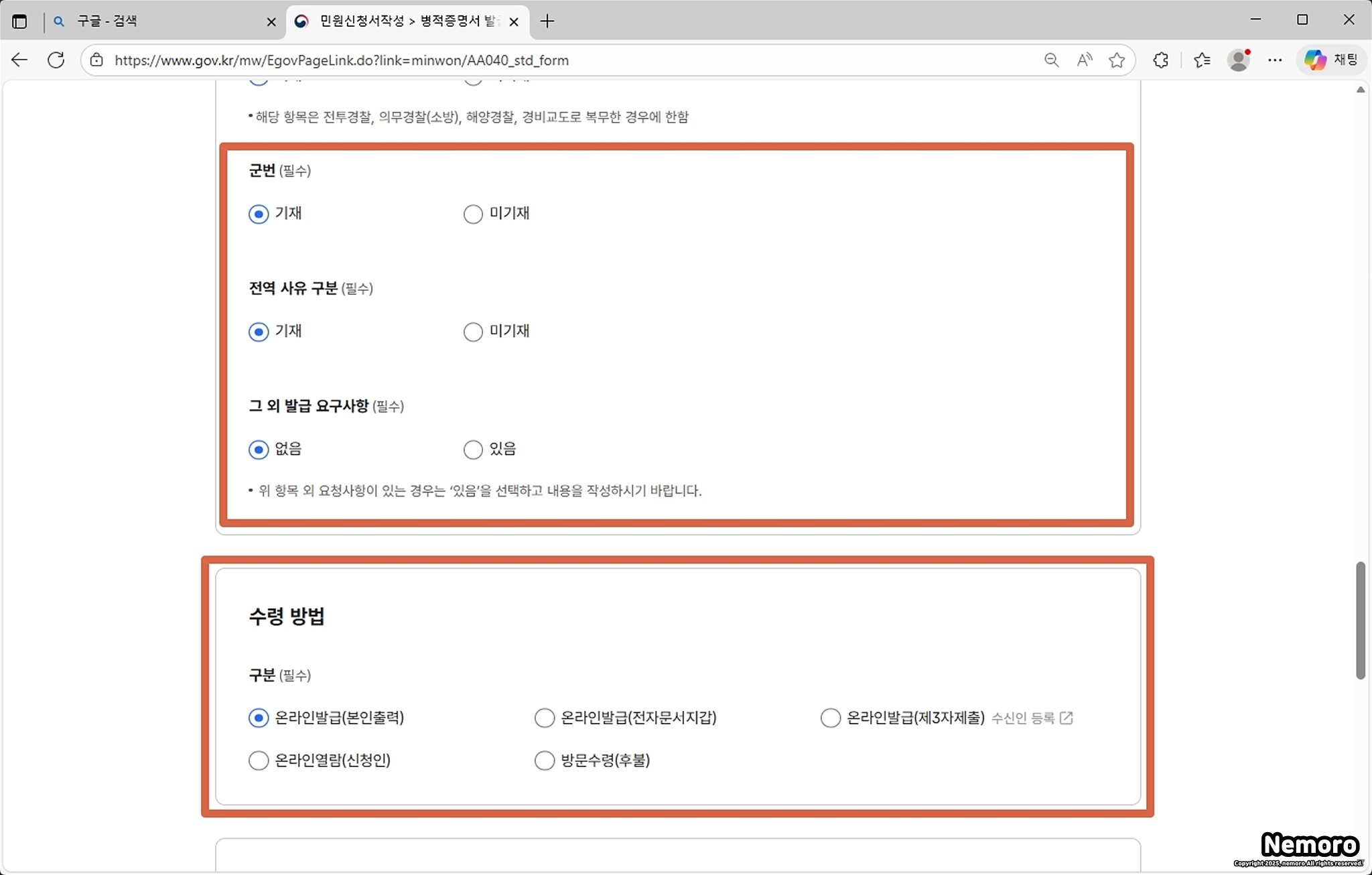 병적 증명서에 기재할 군번, 전역 사유 구분, 그 외 발급 요구사항을 기재, 미기재 선택한 후에, 수령 방법을 선택해 주세요. 프린터 출력 및 PDF 파일로 저장하실 분들은 [온라인 발급(본인 출력)]을 선택하시면 됩니다.