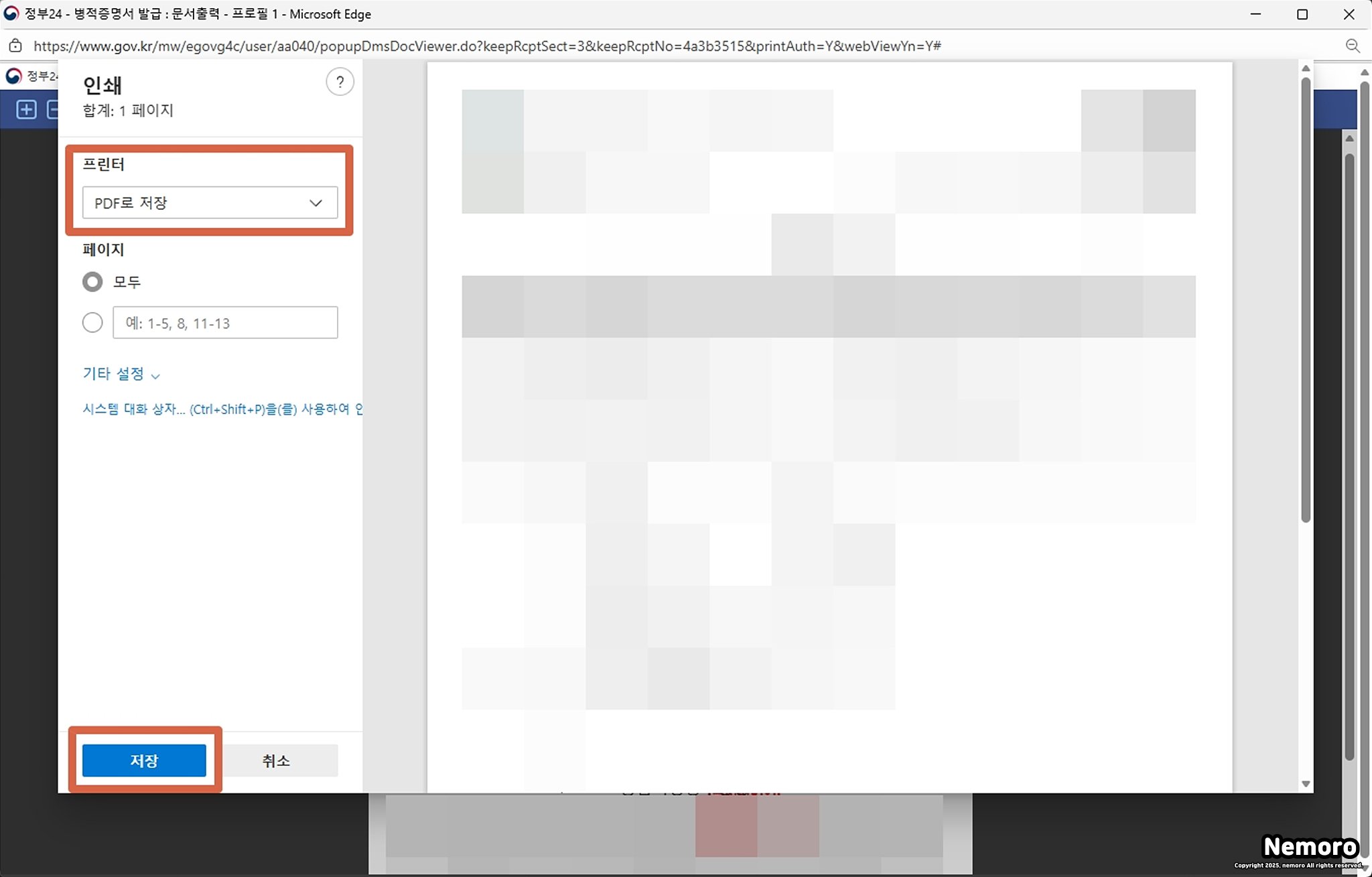 먼저 [인쇄] 버튼을 클릭하시는 방법까지 동일합니다. 그리고 인쇄 페이지가 열리면 [프린터] 탭에서 [PDF로 저장]을 선택하신 후에 [저장] 버튼을 클릭하시면 완료됩니다.