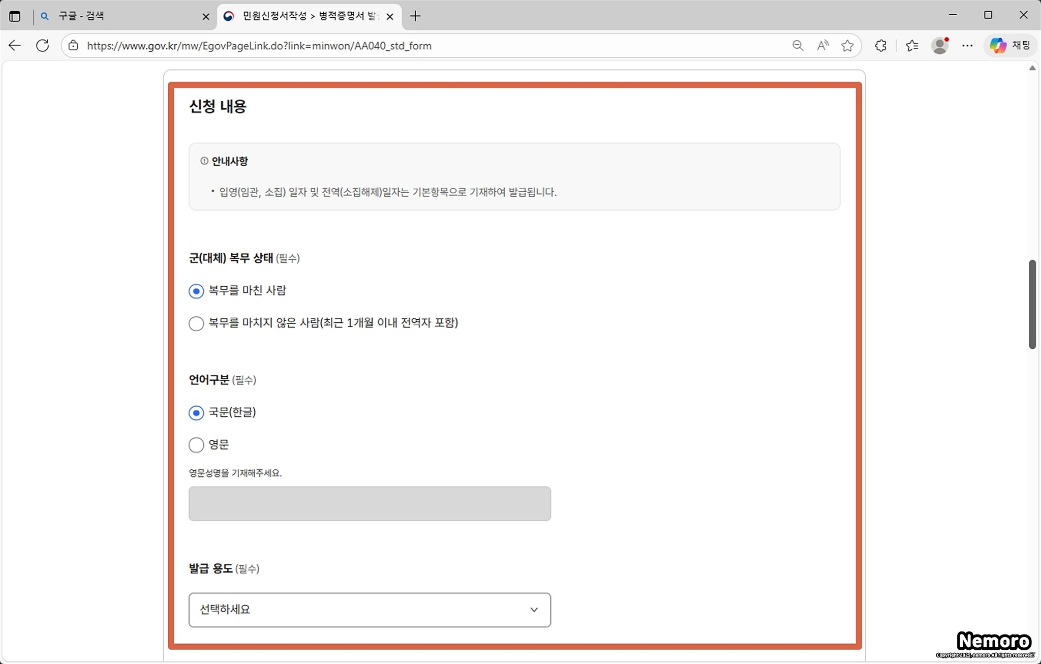 - 병적증명서는 국문(한글)과 영문 발급이 가능합니다. 필요한 언어를 선택해 주세요.