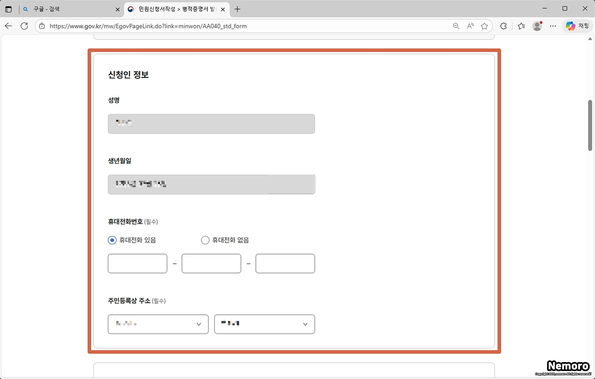 비회원으로 신청하신 분들은 성명, 생년월일만 자동으로 입력이 되어 있습니다. 휴대전화 번호를 입력하고, 주민등록상 주소를 선택해 주시면 됩니다.