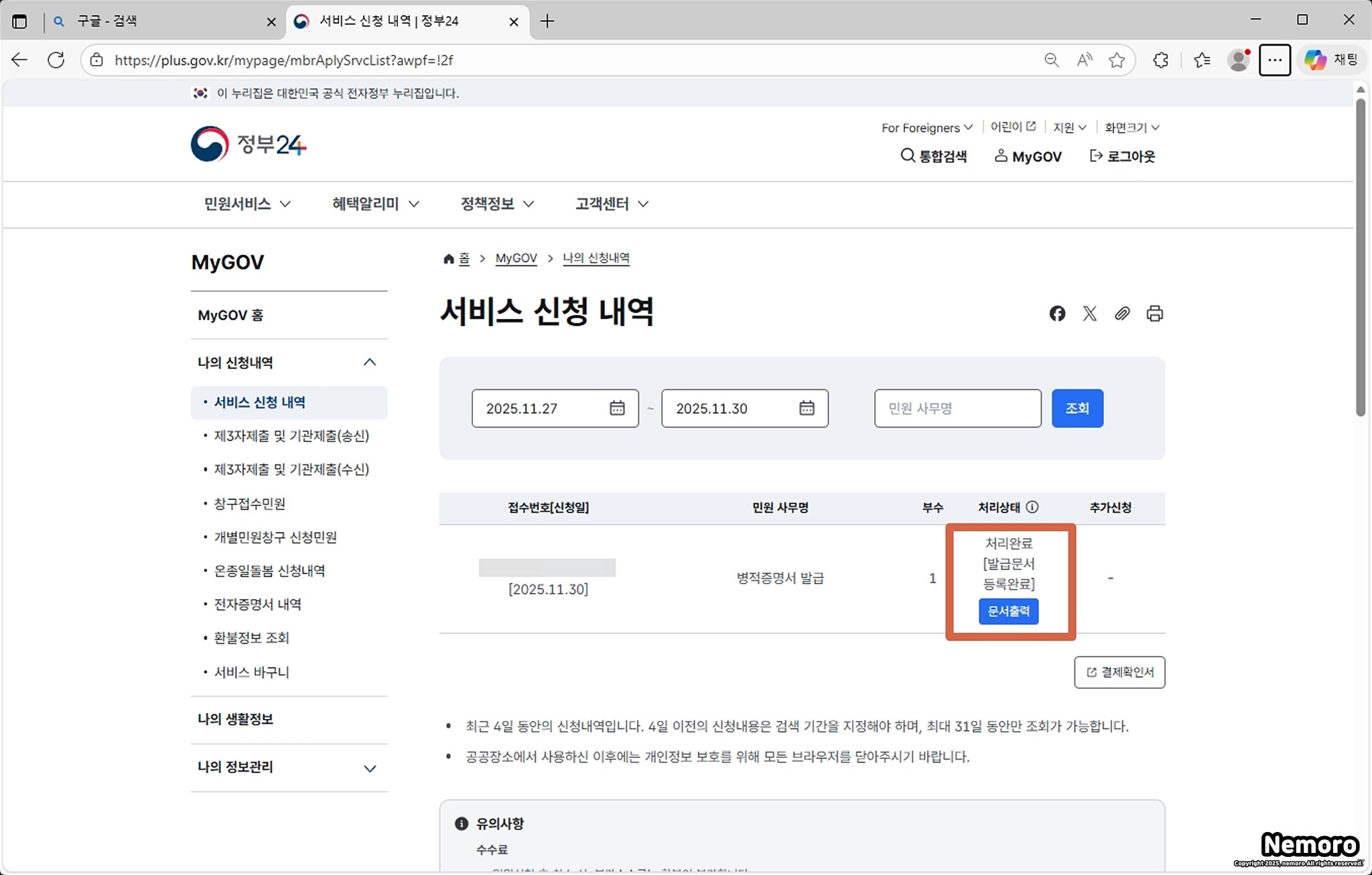 수령 방법을 온라인 발급으로 선택했다면 "서비스 신청 내역" 페이지로 넘어갑니다. 민원 사무명과 발급 부수를 한 번 확인해 주신 후에 [처리 상태] 탭에서 [문서 출력] 버튼을 선택해 주세요.