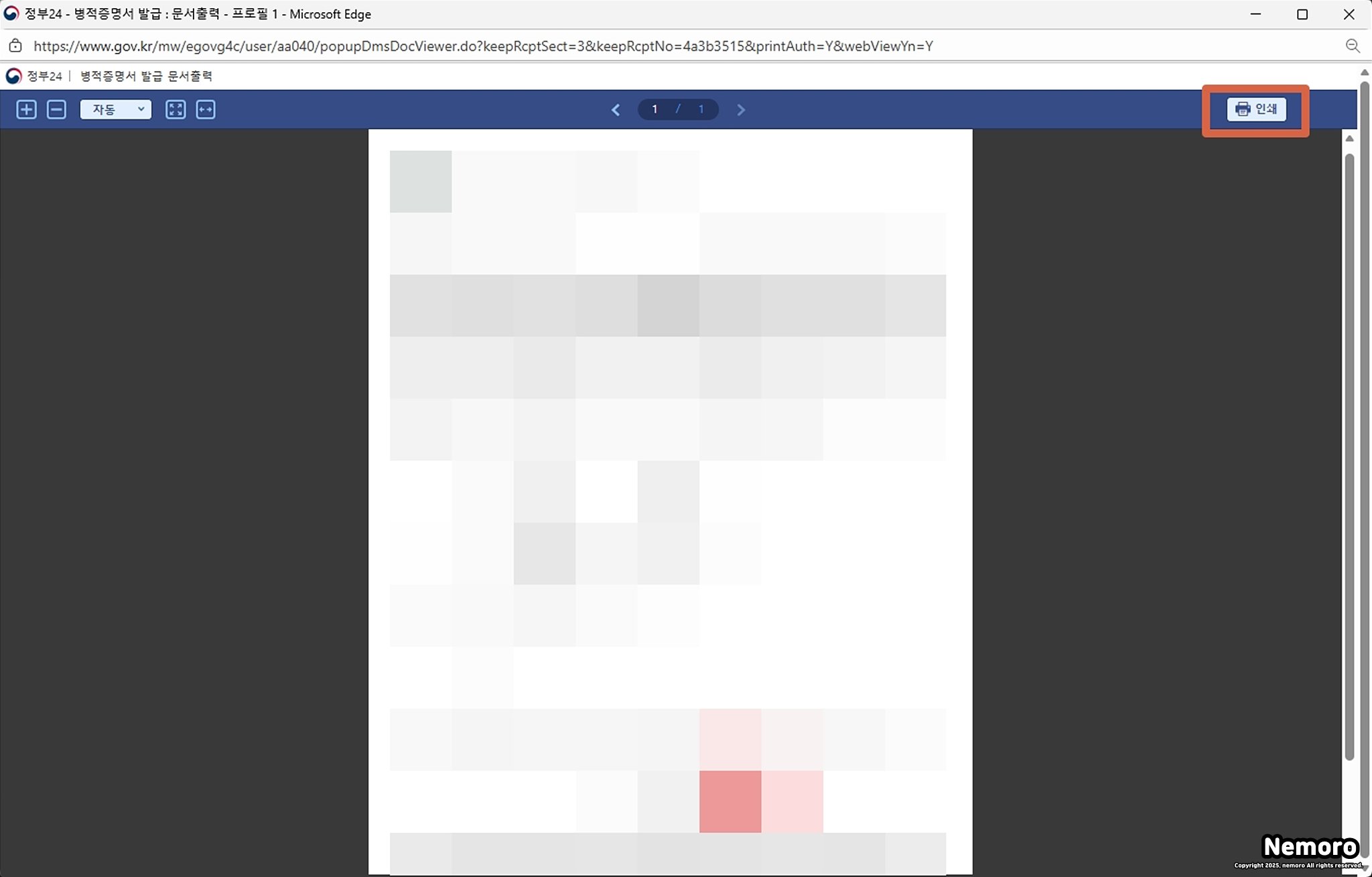 병적 증명서 인쇄 페이지가 추가로 생성되면 서류를 한 번 확인하신 후에 우측 상단에 있는 [인쇄] 버튼을 클릭하셔서 프린터로 출력하시면 됩니다.
