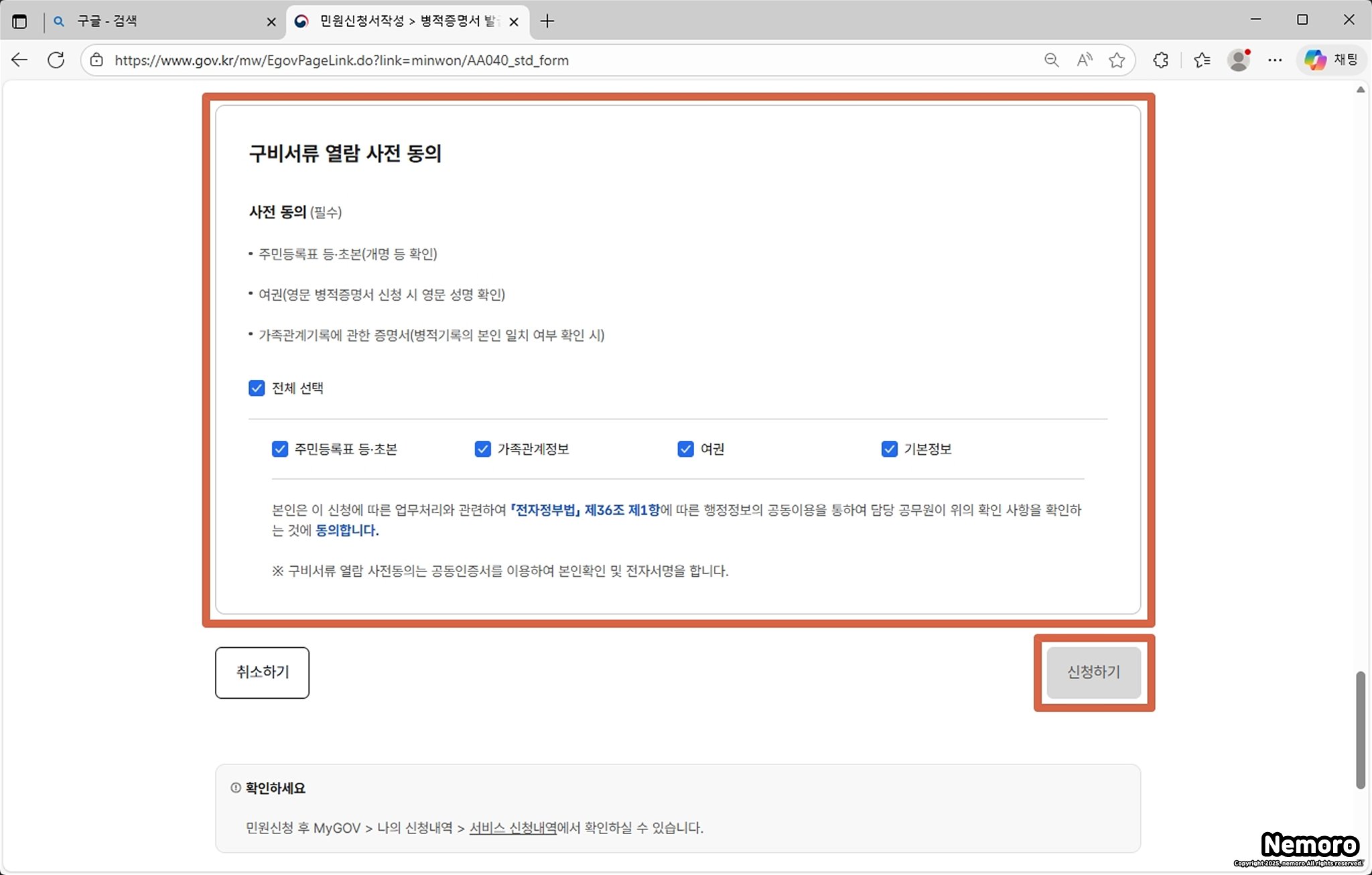 - 사전 동의만 진행하면 알아서 서류를 열람해 주니 체크만 해주시면 됩니다.