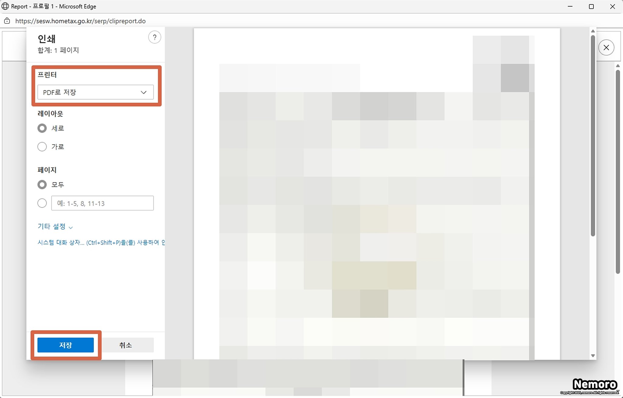 프린터 모양 아이콘을 클릭하는 방법까지 동일합니다. 인쇄 페이지가 활성화되면 [프린터] 탭에서 [PDF로 저장]을 선택하신 후에 [저장] 버튼을 클릭하시면 PDF 파일로 저장이 완료됩니다.