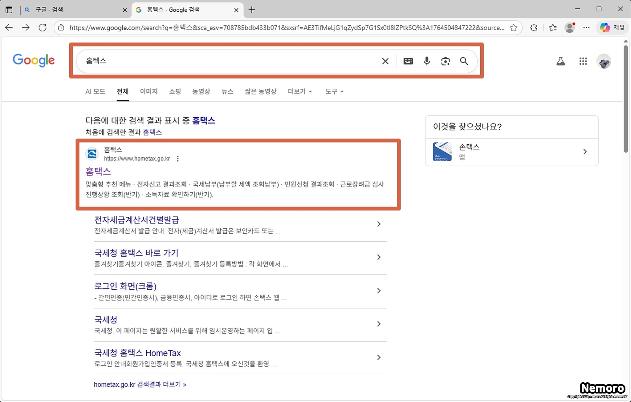 인터넷을 통해서 사업자 등록증명을 발급받기 위해서는 홈택스 사이트를 이용해야 합니다. 구글, 네이버, 다음 등 포털 사이트 검색창에 [홈택스]를 검색하셔서 사이트에 접속해 주세요.