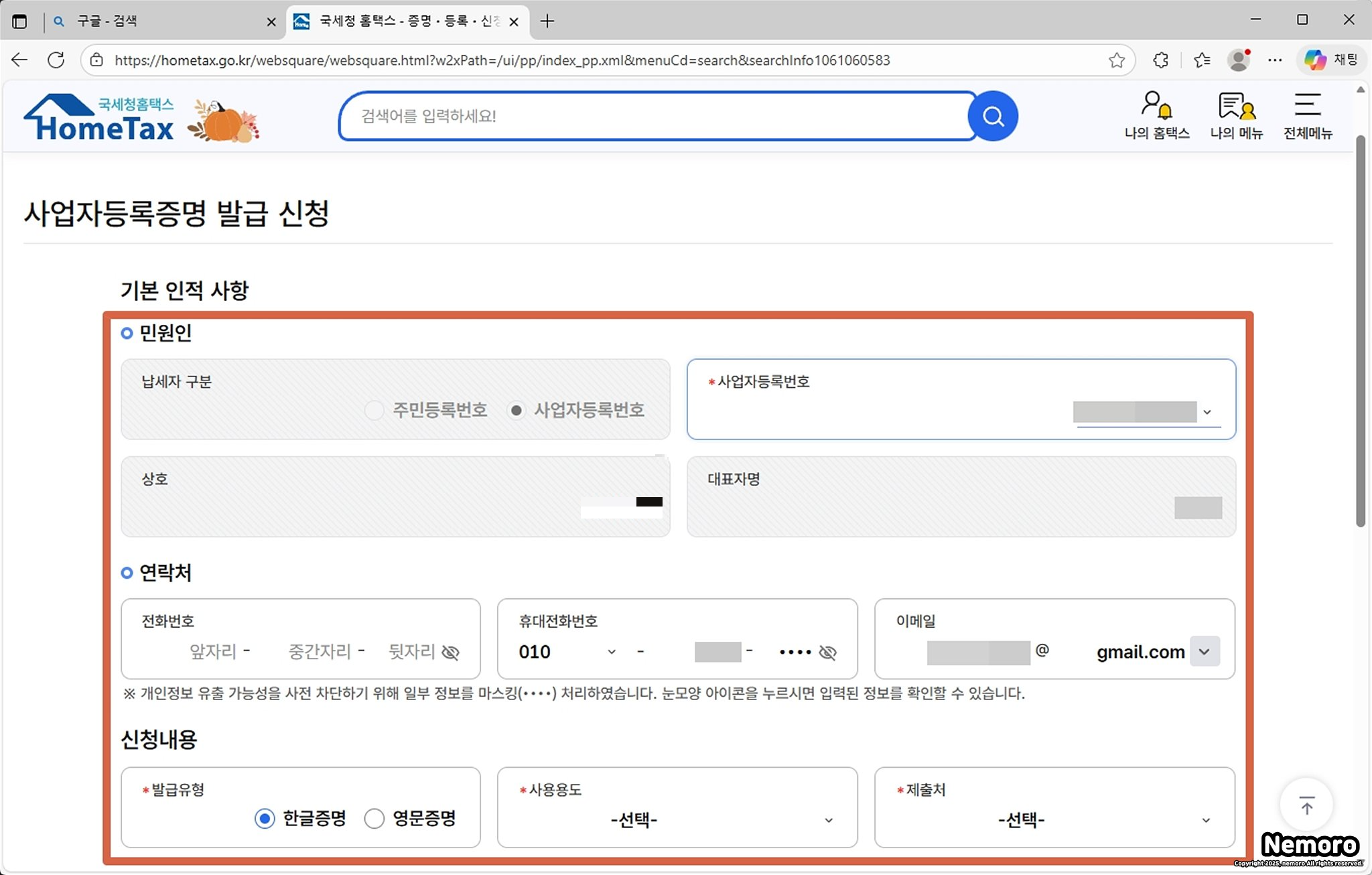 [민원인] 탭에서 [사업자등록번호]를 선택하시면 전화번호, 휴대전화 번호, 이메일이 자동으로 입력됩니다. [신청 내용] 탭을 확인 후, 발급 유형, 사용 용도, 제출처를 선택해 주세요.
