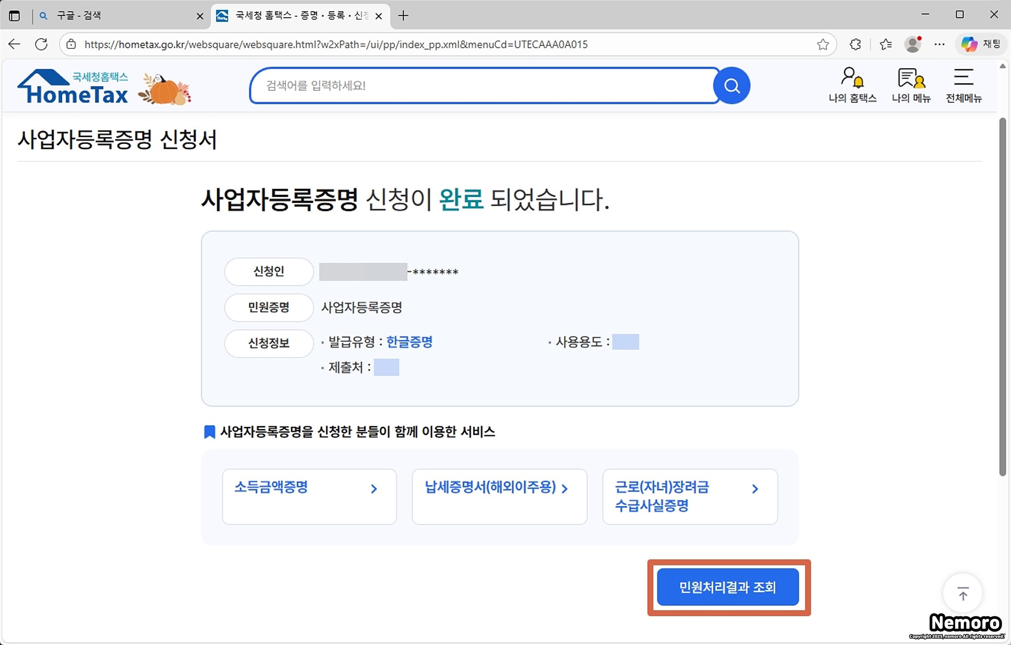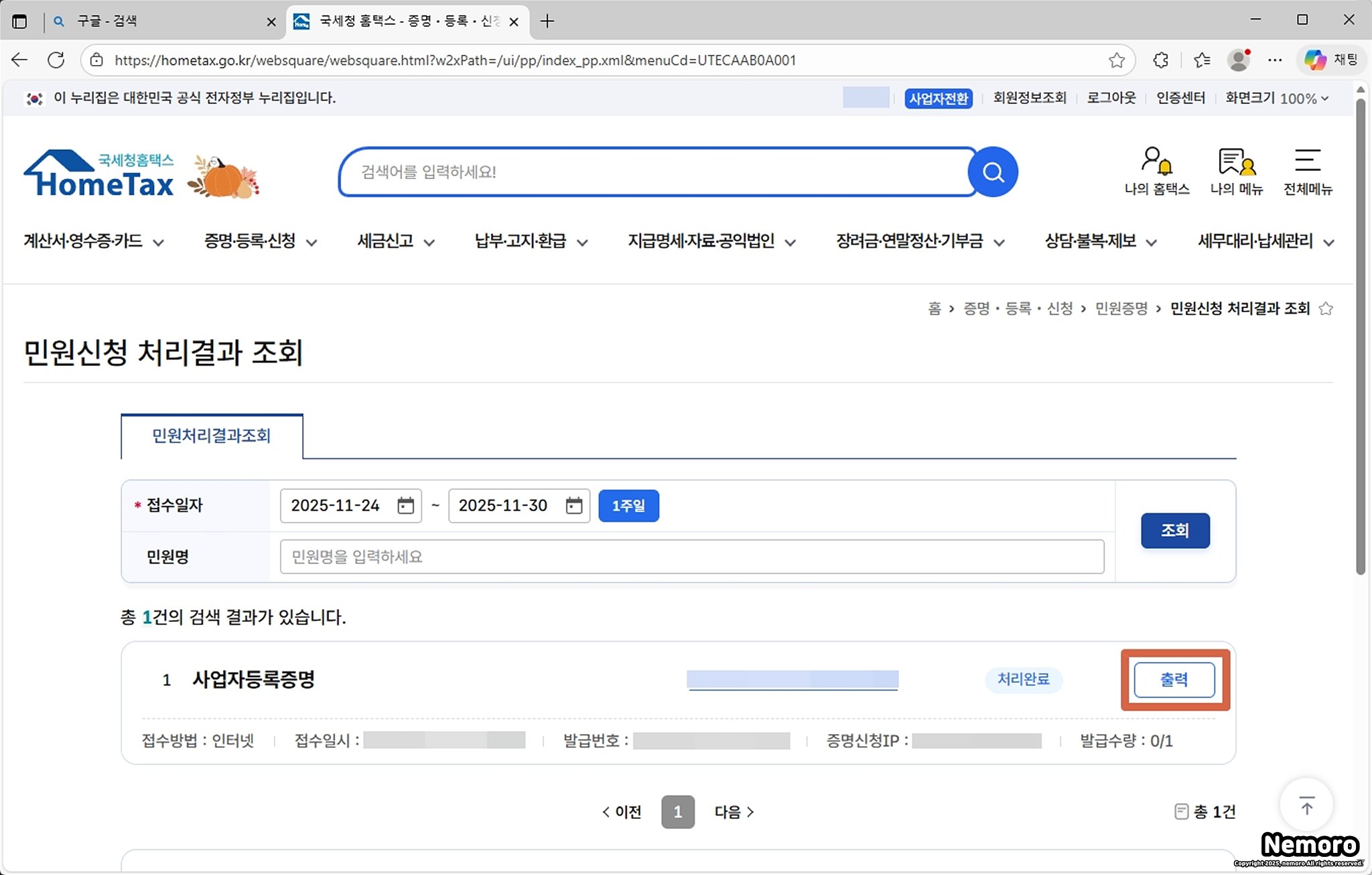 사업자 등록증명 발급 완료하기