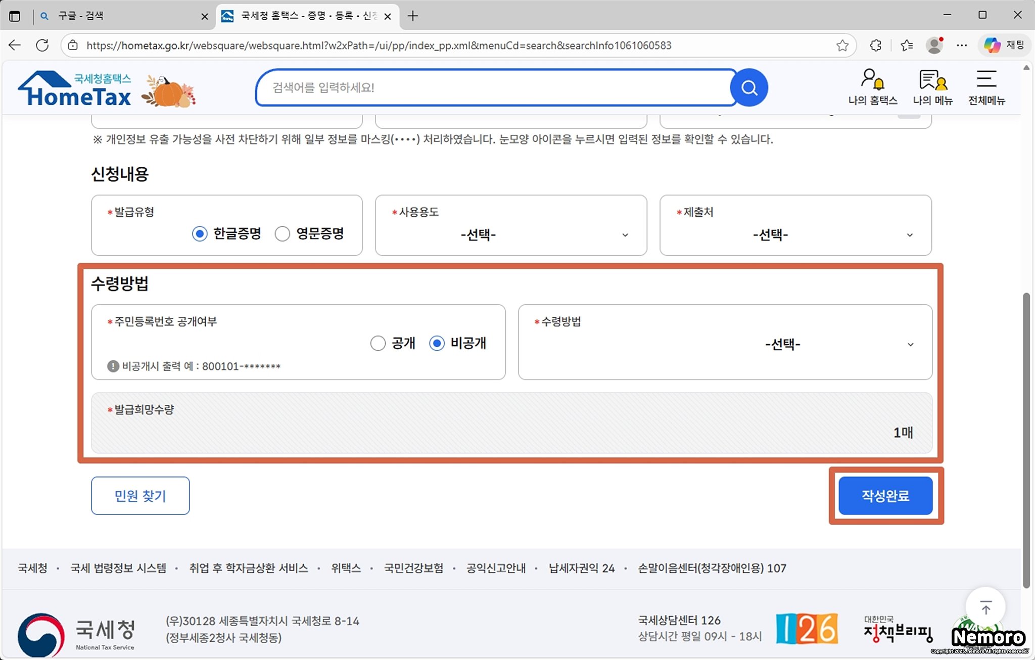 주민등록번호 공개 여부와 수령 방법 및 발급 희망 수량을 선택한 후, 작성완료 버튼을 눌러주시면 됩니다.