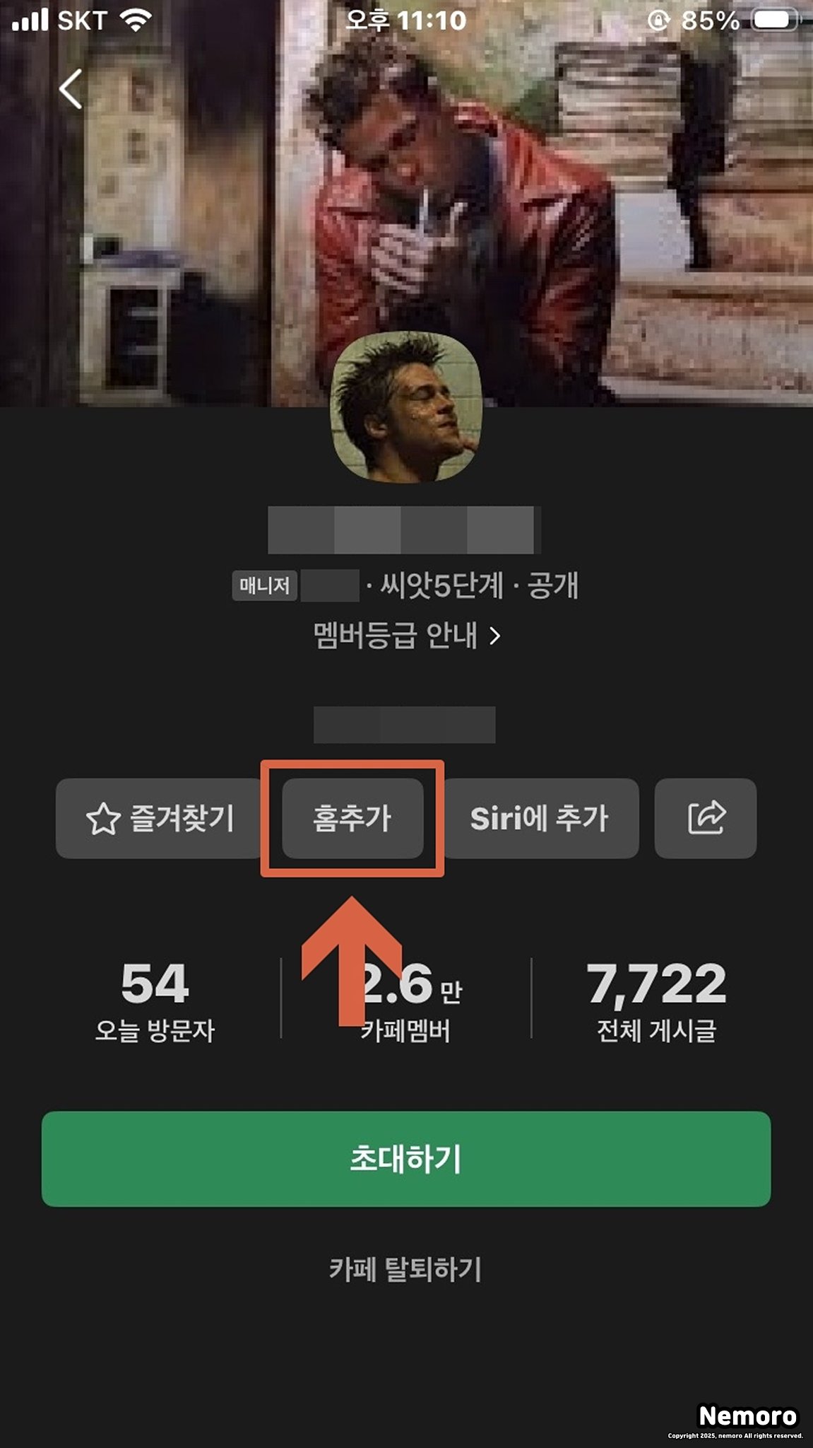 이 화면에서 [홈 추가] 버튼을 찾을 수 있는데, 바로 이 기능을 통해 홈 화면에 카페 바로가기 아이콘을 만들 수 있습니다.
