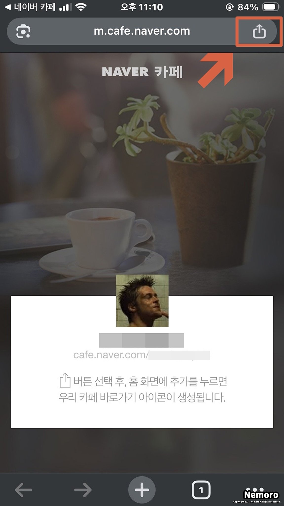 [홈 추가] 버튼을 누르면 자동으로 사파리 브라우저에서 해당 카페의 모바일 웹 주소가 열립니다. 이제 오른쪽 상단에 보이는 [공유 아이콘]을 선택해 주세요.