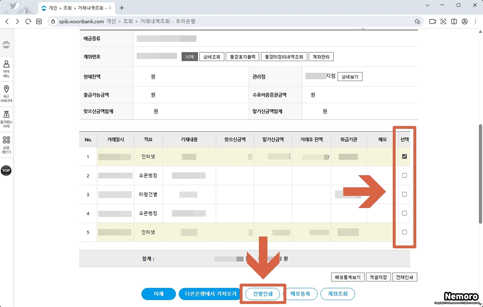 이번에는 거래 내역을 건별로 인쇄하는 방법입니다. 인쇄하고자 하는 거래 내역을 클릭하여 선택해 주세요. 그리고 [건별 인쇄] 버튼을 클릭해 주시면 됩니다.