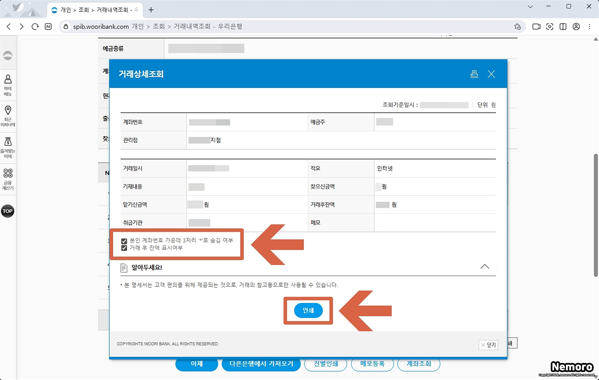 해당 거래 내역의 상세 정보가 표시됩니다. [계좌번호 가운데 3자리 ***로 숨김 여부]와 [거래 후 잔액 표시 여부]를 체크해 주신 후에 [인쇄] 버튼을 선택해 주세요.