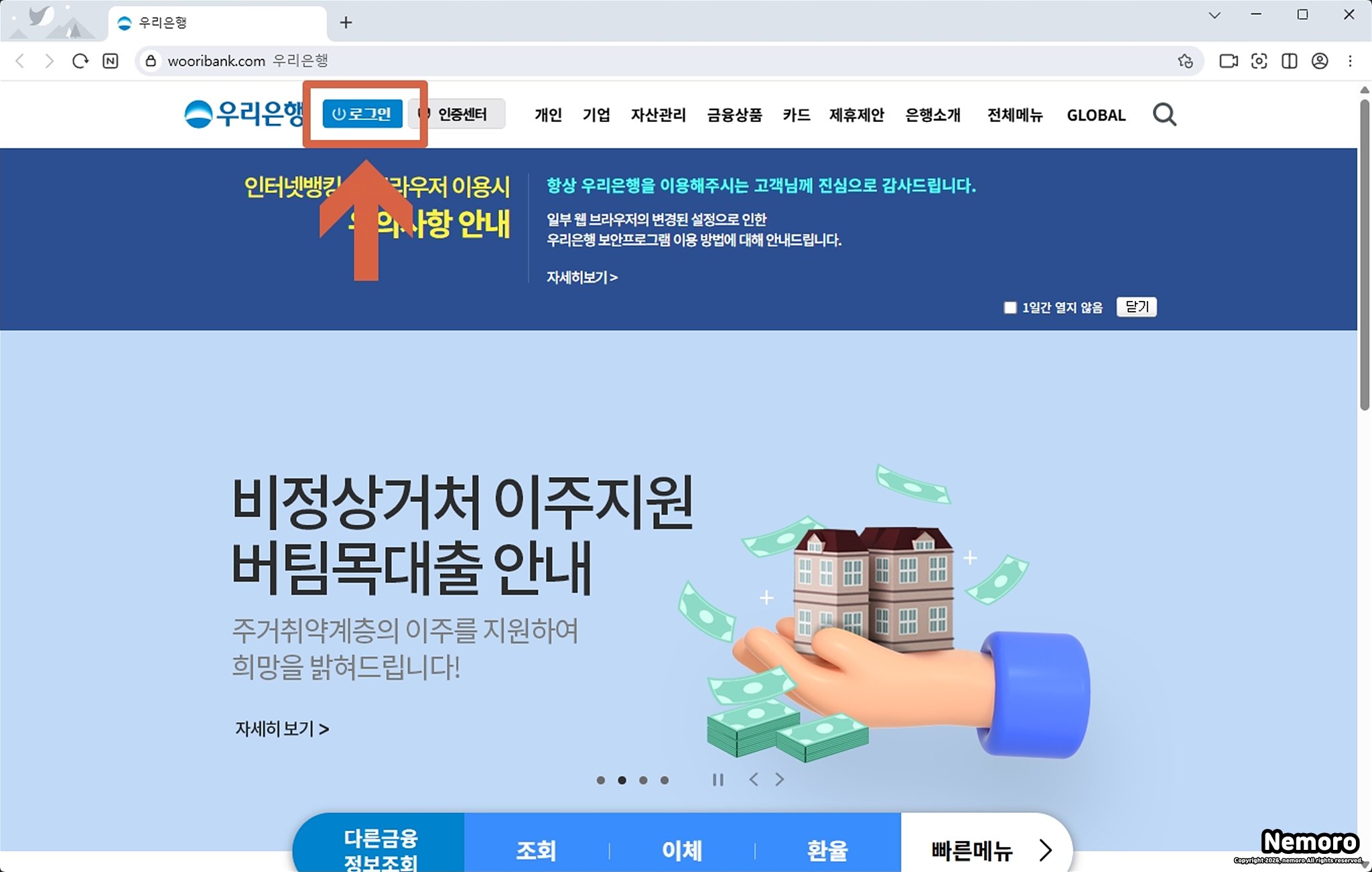 그리고 왼쪽 상단에 있는 [로그인] 버튼을 선택하여 금융인증서, 공동인증서, 우리 WON인증서, 아이디 중 골라서 로그인을 진행해 주시면 됩니다.