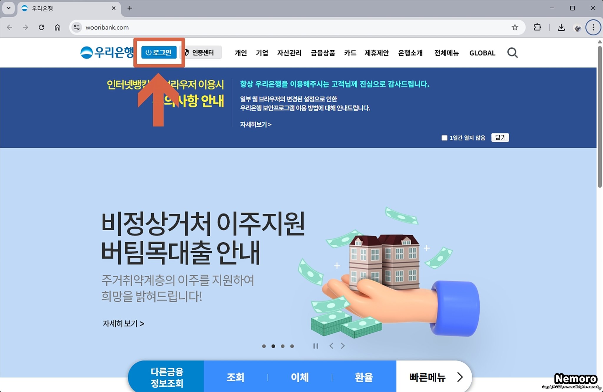 구글, 네이버, 다음 등 검색이 가능한 포털 사이트에 [우리은행]을 검색하신 후, 해당 은행의 인터넷 뱅킹 사이트에 접속해 주세요.