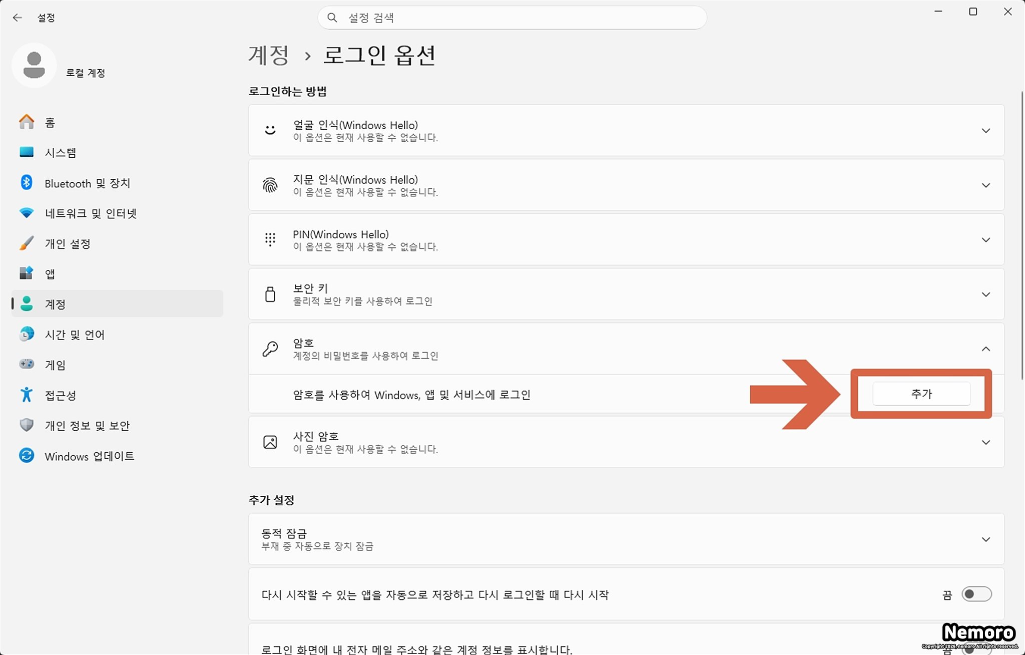 여러 인증 방식 중 열쇠 모양의 [암호] 탭을 클릭하여 메뉴를 확장합니다. 현재 암호가 없는 로컬 계정 상태라면 하단에 [추가] 버튼이 나타납니다.