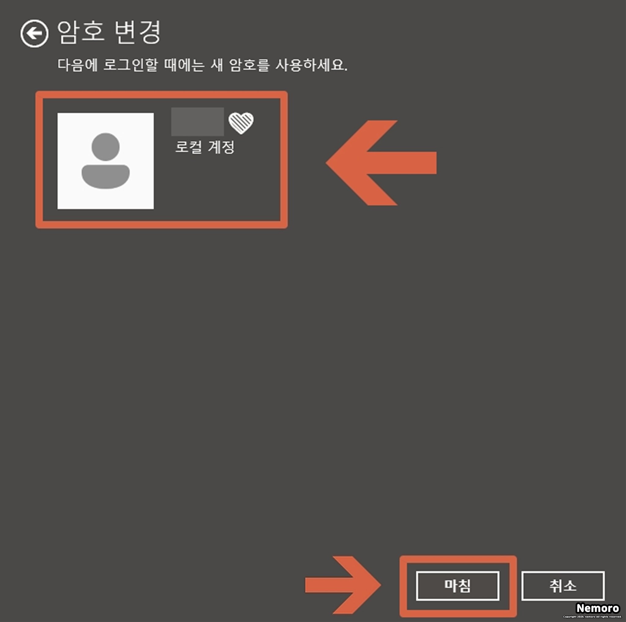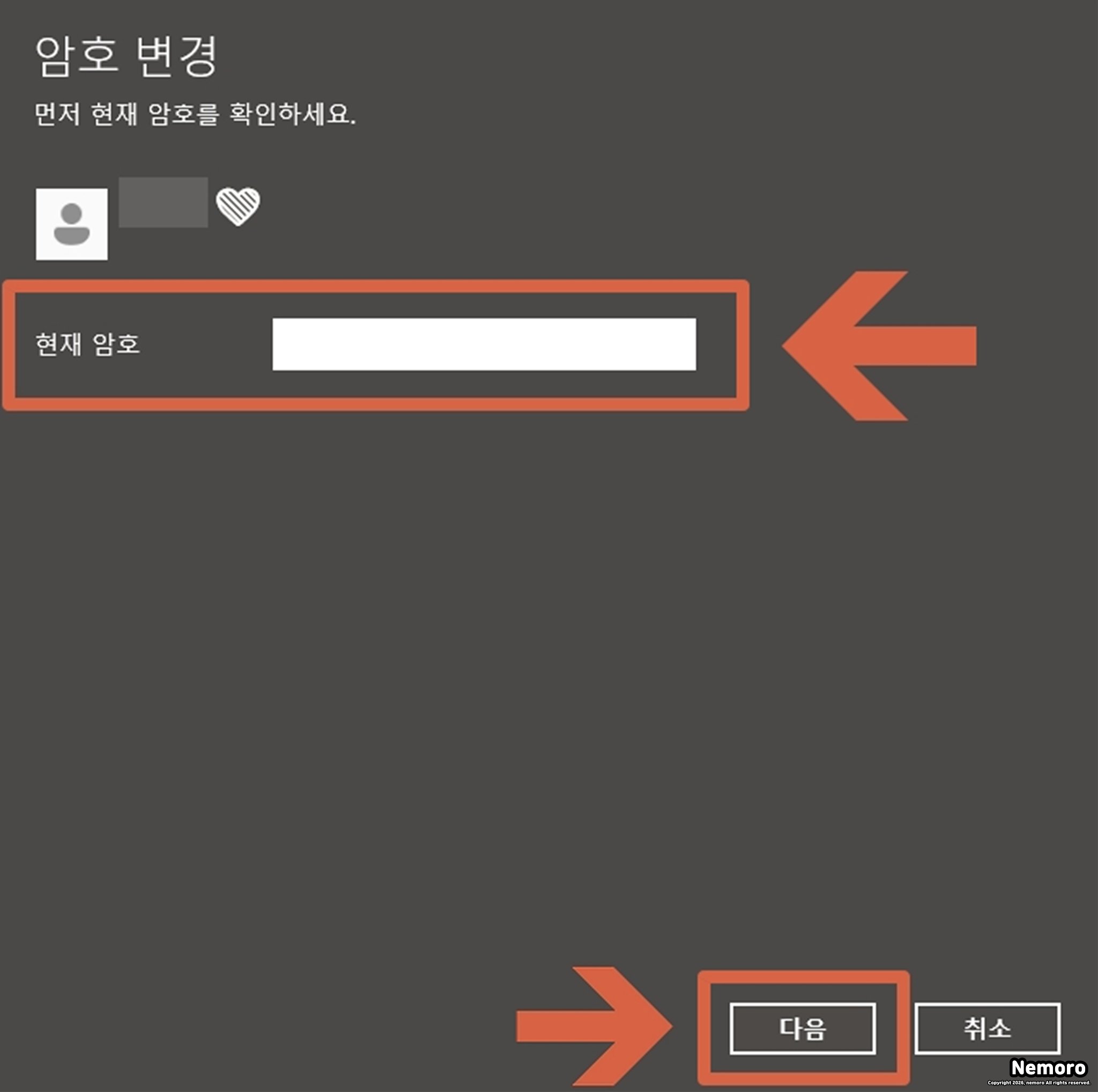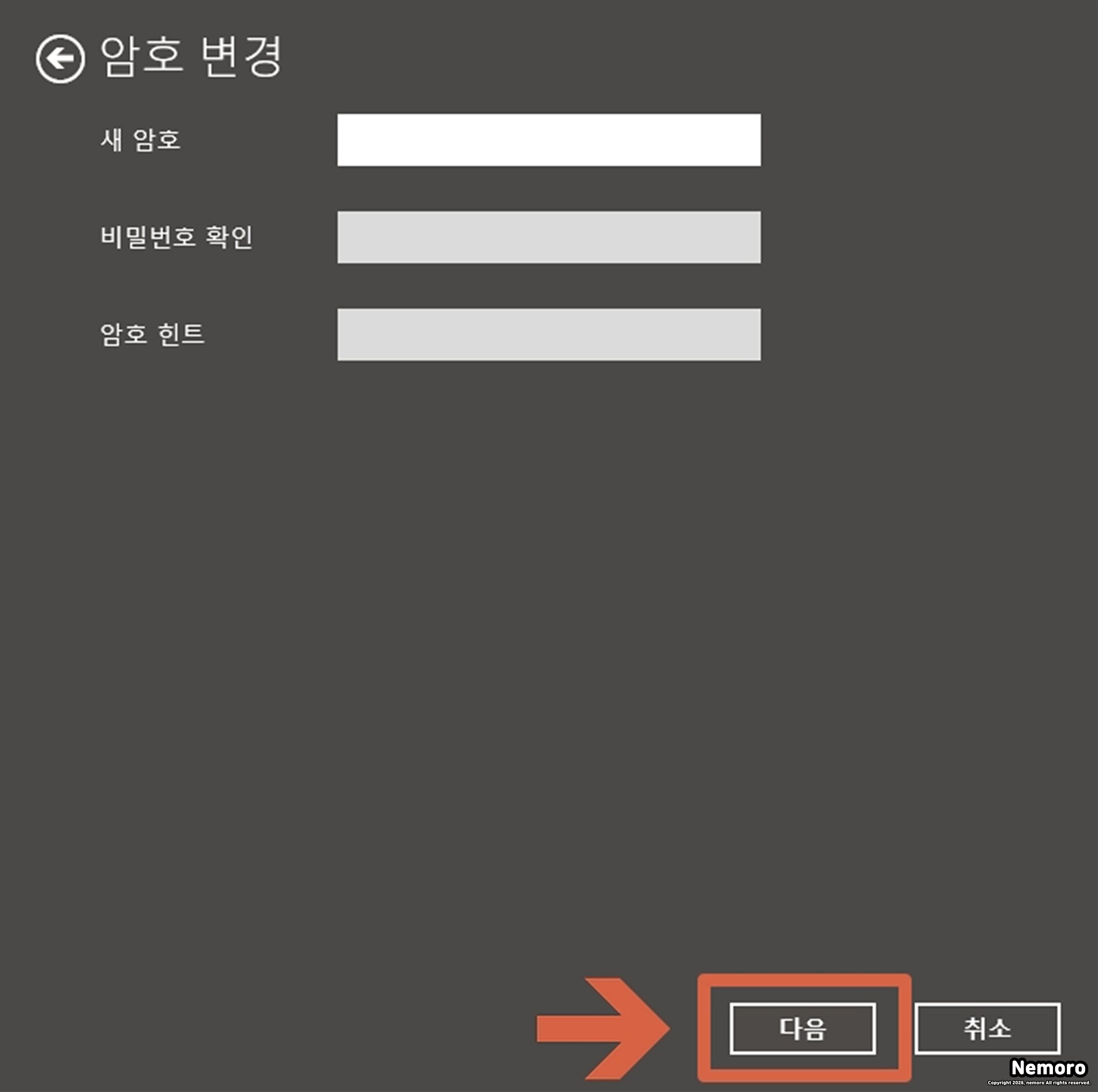 보안을 위해 [현재 암호]를 먼저 입력하고 다음을 클릭합니다. 이후 나타나는 새 암호 입력창에서 아무것도 입력하지 않은 빈칸 상태로 [다음]과 [마침]을 차례로 누르면 기존 암호가 완전히 삭제됩니다.