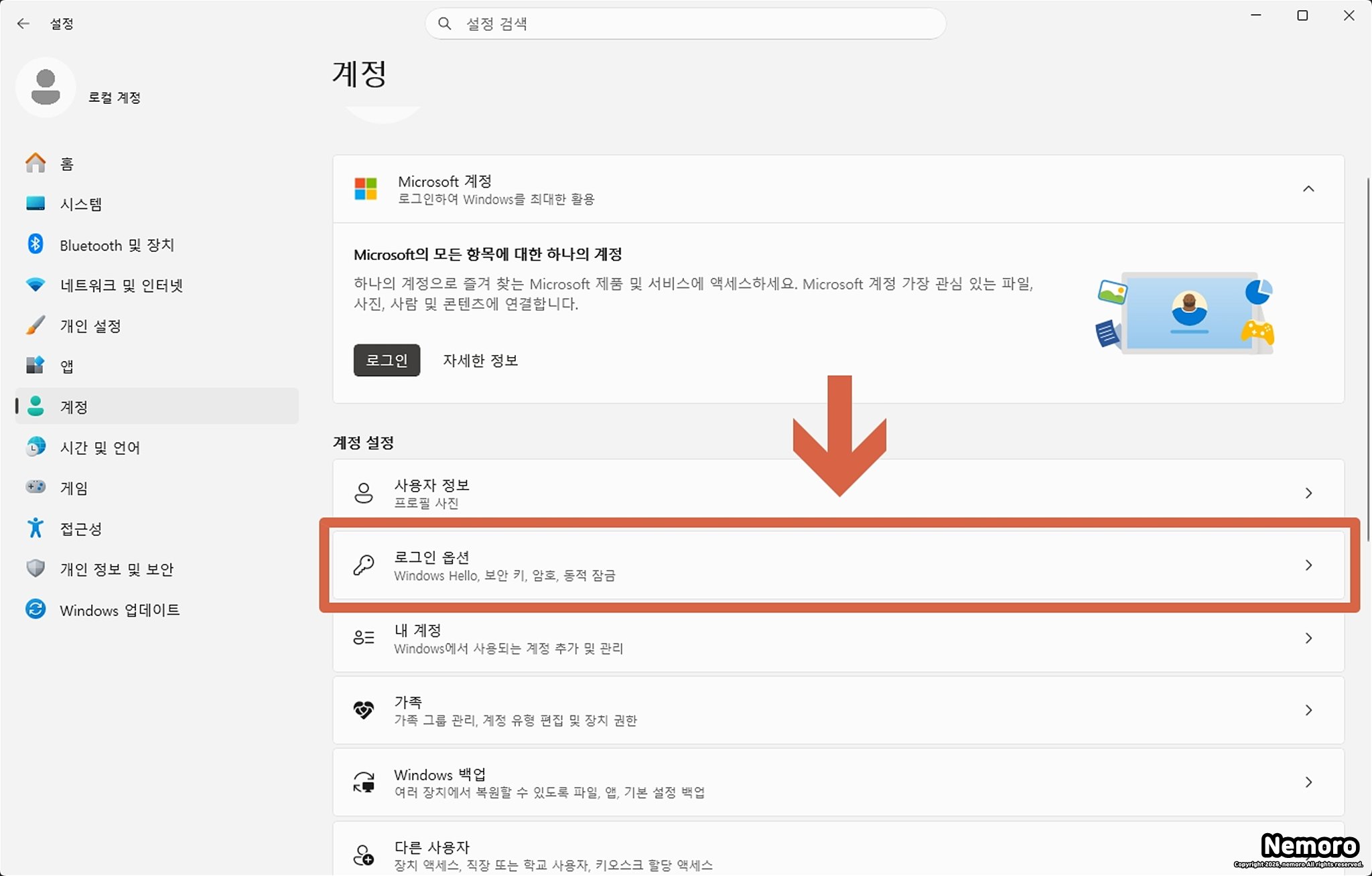 로그인 옵션 항목 찾기