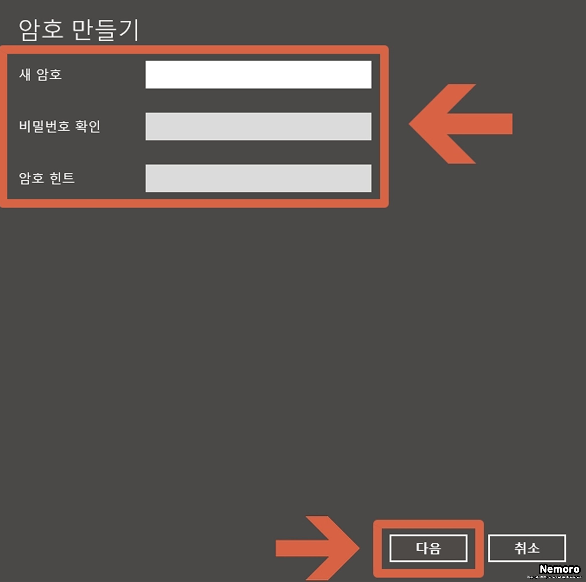 [암호 만들기] 창에서 사용할 새 암호와 확인용 암호를 입력하고, 잊어버렸을 때를 대비한 힌트까지 작성한 뒤 [다음] 버튼을 선택해 주세요.