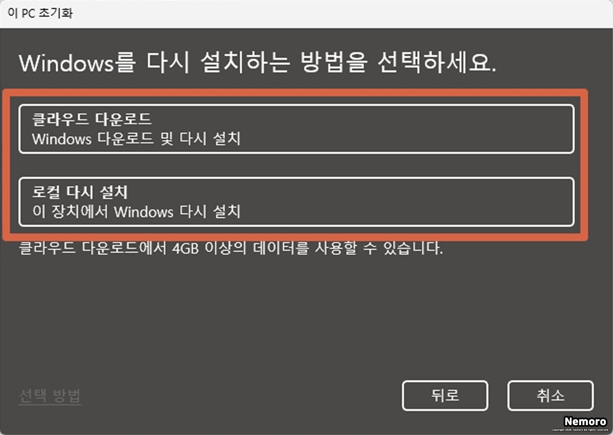 [클라우드 다운로드]는 MS 서버에서 최신 버전의 파일을 새로 내려받는 방식이며, 약 4GB 이상의 데이터가 소모됩니다. [로컬 다시 설치]는 현재 PC에 내장된 파일을 활용하는 방식입니다.