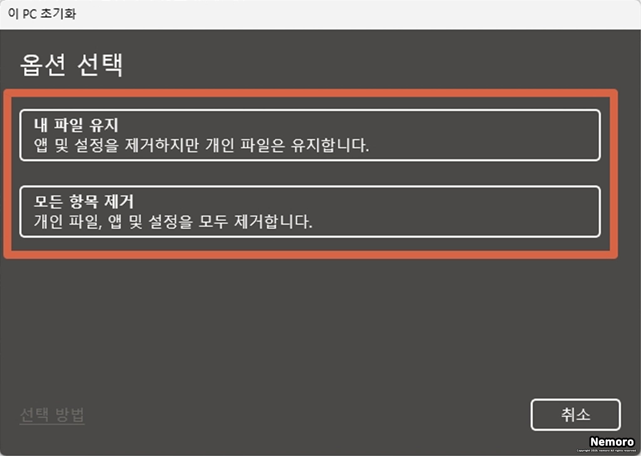 내 파일 유지 및 모든 항목 제거 옵션 선택