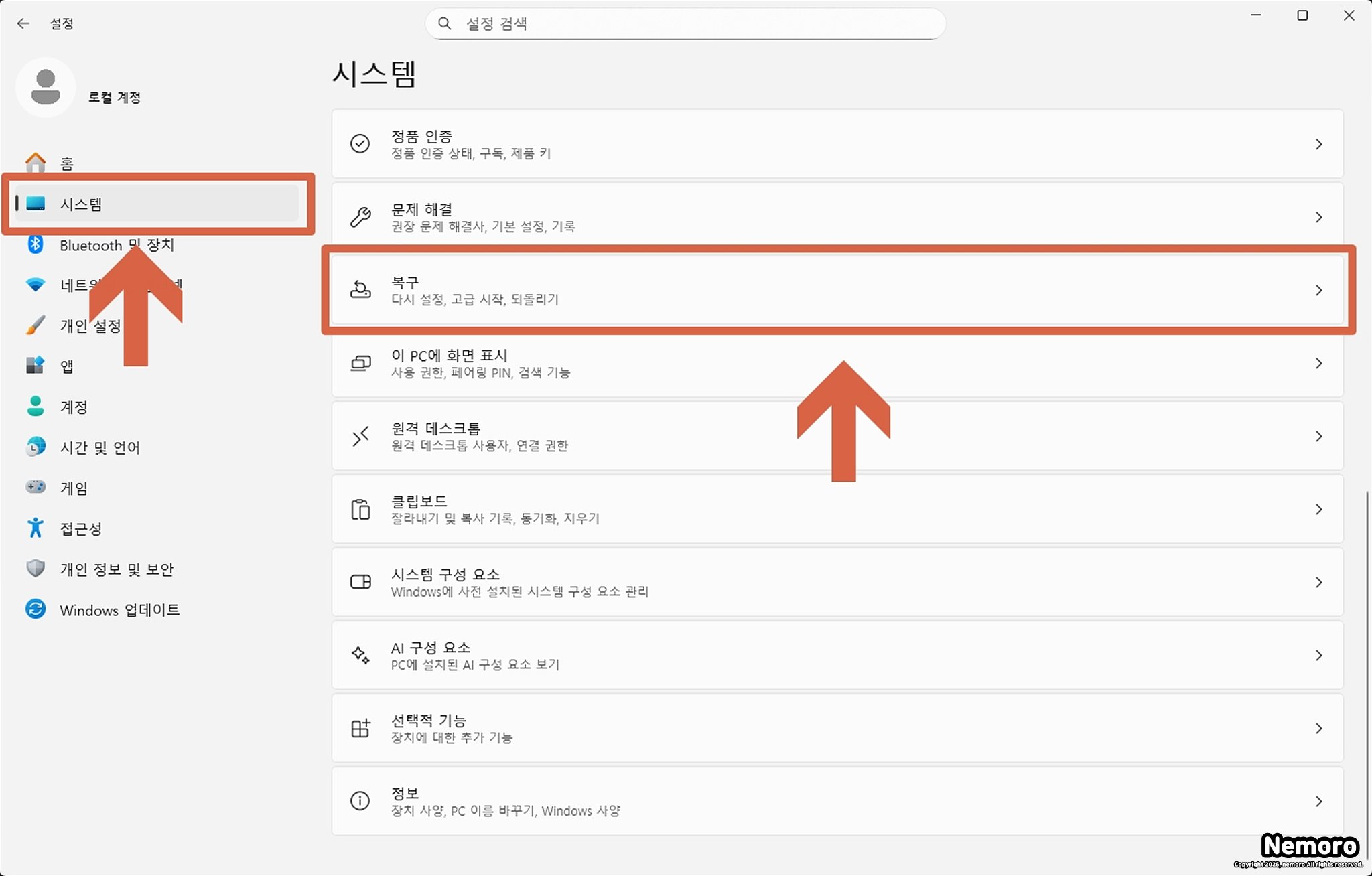 시스템 메뉴 내 복구 탭 선택